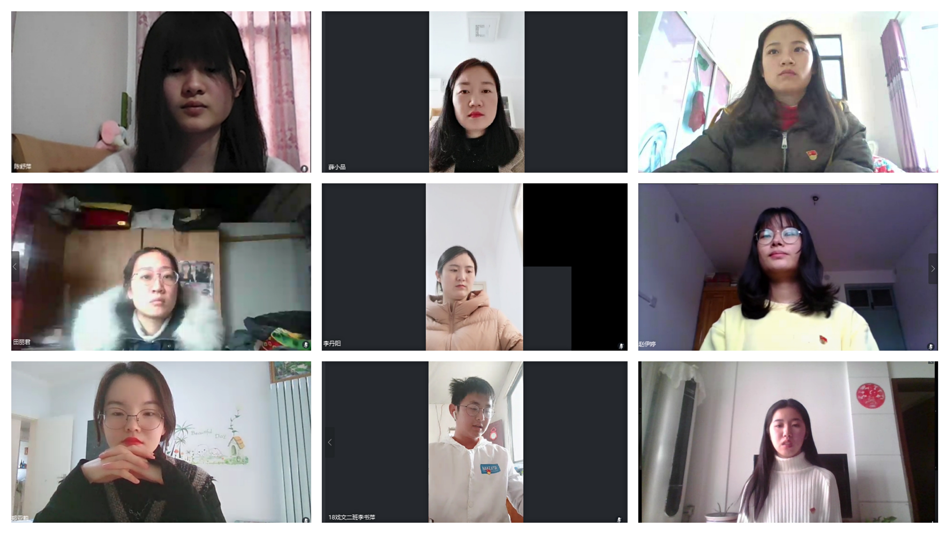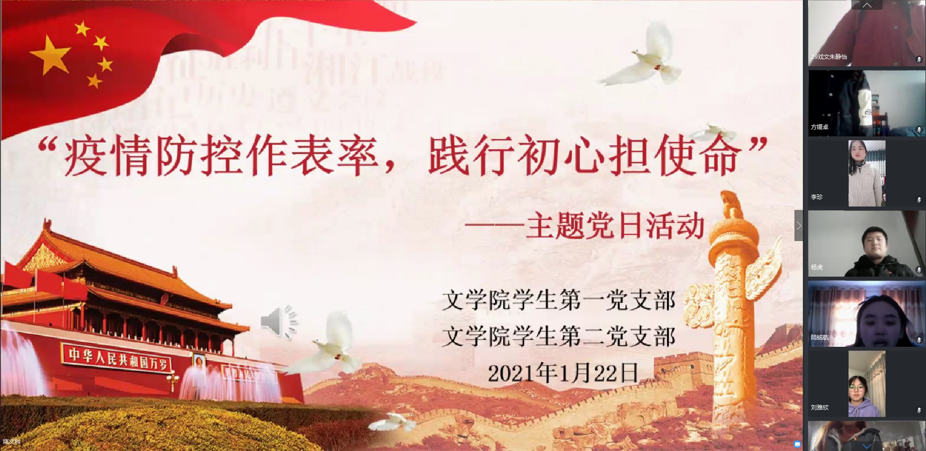 1月22日下午,文学院学生第一、第二党支部以线上形式开展了“疫情防控做表率,践行初心担使命”主题党日活动。主题党日活动由学生党支部书记薛小品主持。