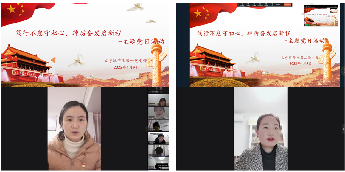 2022年1月9日晚,文学院学生第一、第二党支部分别在线上开展了“笃行不怠守初心,踔厉奋发启新程”主题党日活动,全体学生党员参加活动。