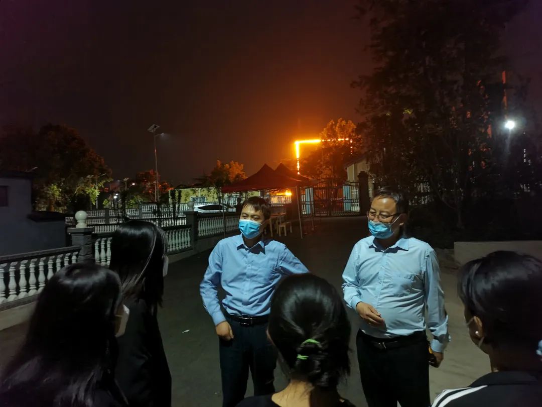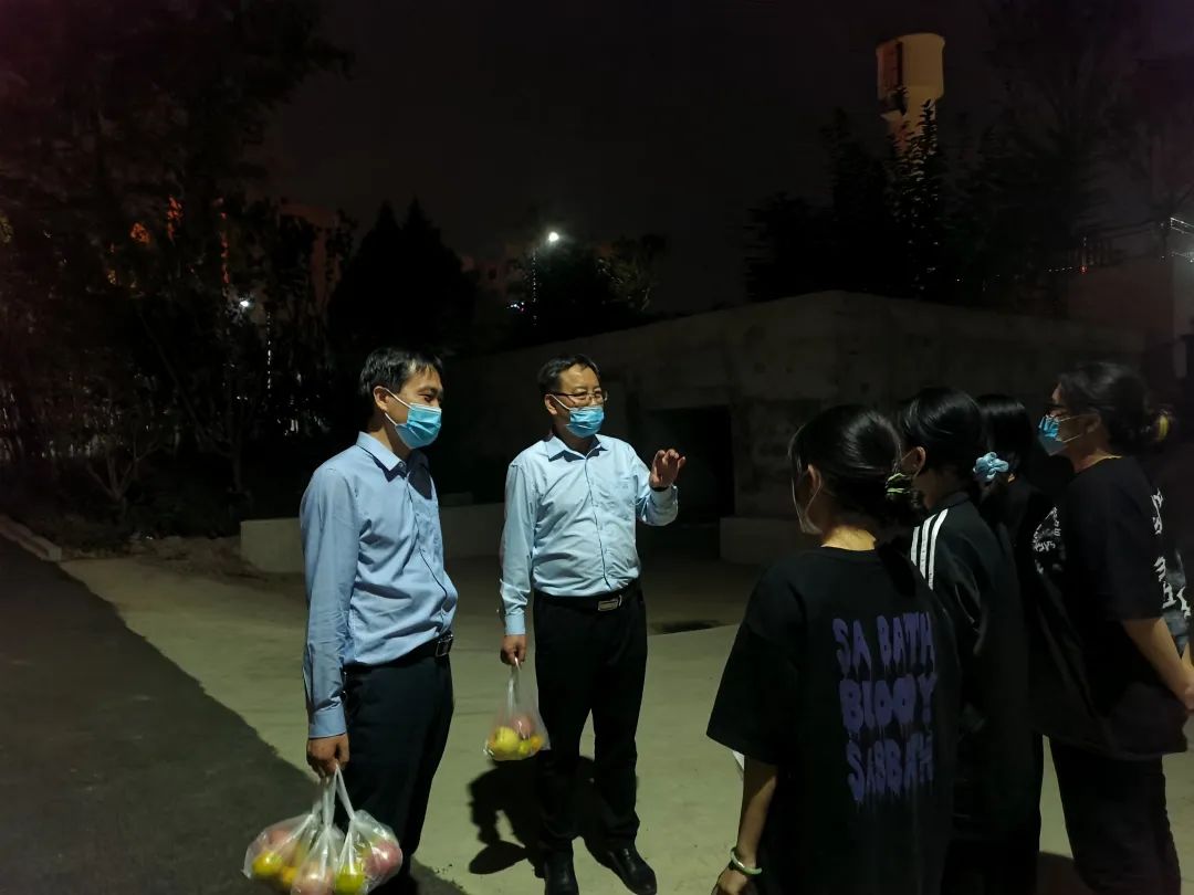 文学院党委书记申自强、副书记李培斌深夜慰问健康监测的学生(图/贾俊达)