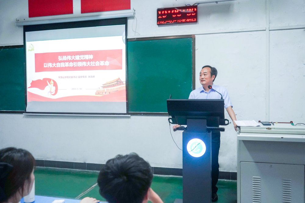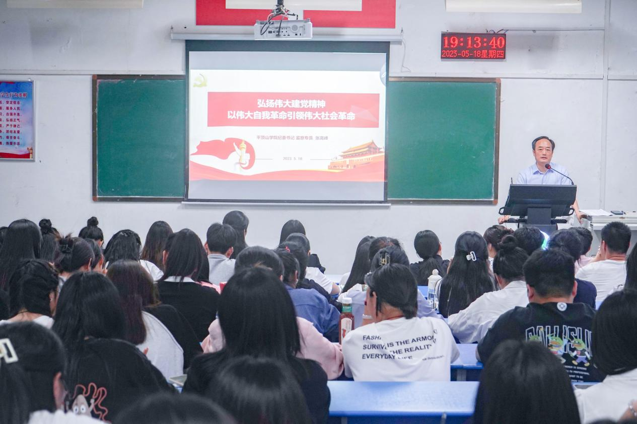 5月18日晚,校纪委书记、监察专员张高峰在1号教学楼1307教室以“弘扬伟大建党精神 以伟大自我革命引领伟大社会革命”为主题,为学校第十八期党员发展对象培训班(3班)学员讲授了一堂精彩生动的主题教育专题党课。