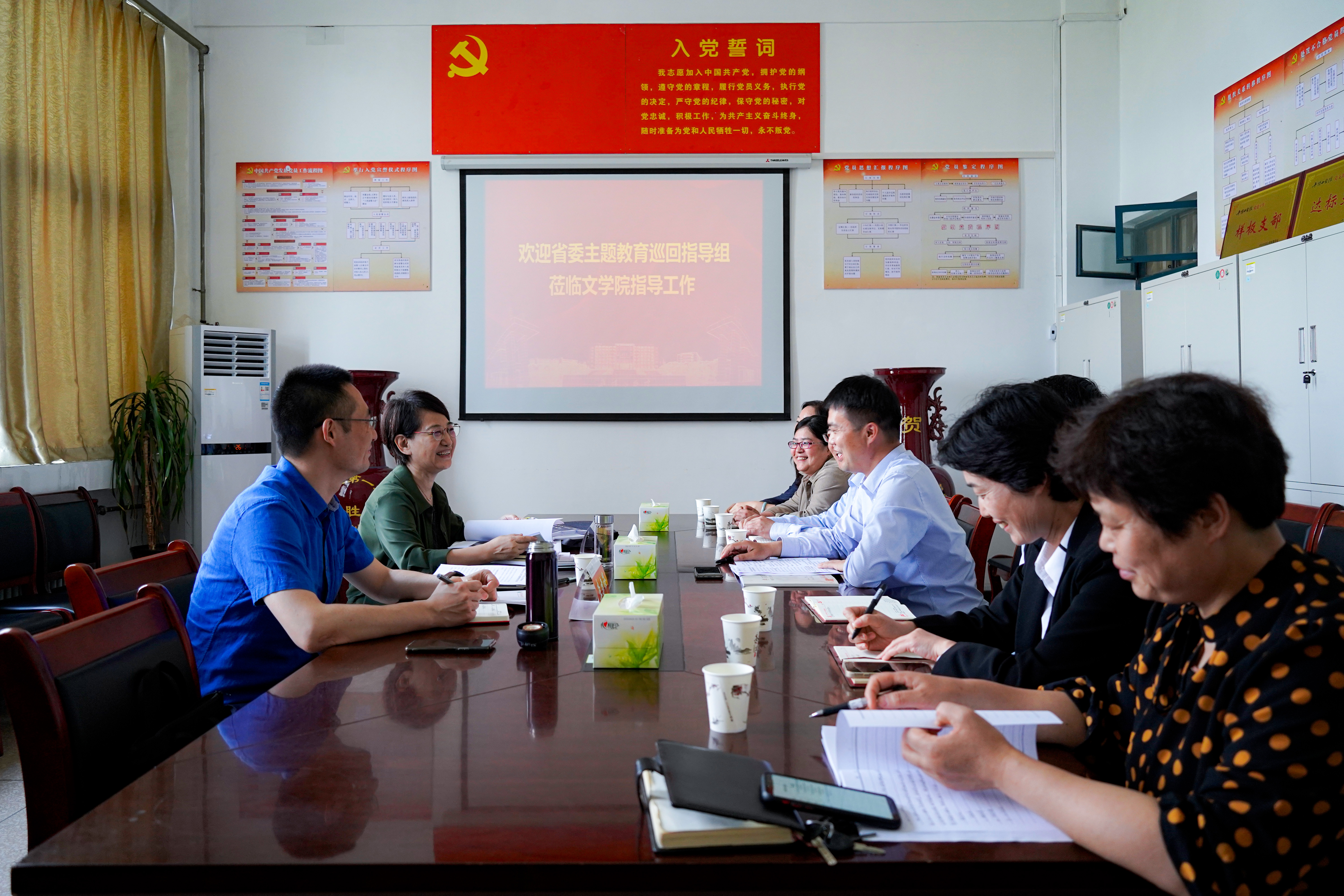 5月25日下午,省委主题教育第二十七巡回指导组副组长庆志英、成员李建锋一行深入文学院调研指导主题教育开展情况,通过座谈交流、实地走访、查阅资料等方式,对学习贯彻习近平新时代中国特色社会主义思想主题教育进行现场指导。文学院领导班子成员、党支部书记和党员教师代表参加调研座谈。