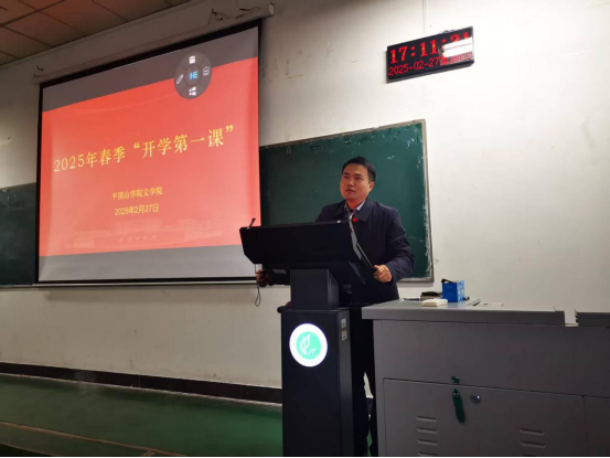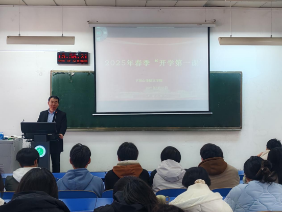 2月27日下午,文学院党委书记申自强在1号楼1306教室为文学院学生讲授开学第一课,文学院党委副书记苏小玲、全体辅导员及150余名学生代表参加了活动。开学第一课上,申自强以“平顶山学院2024年度新闻”为切入点,全面梳理了学校2024年事业发展取得的显著成绩,介绍了学校2025年“十件大事”“21个方面”重点工作的安排部署,并以“坚守、使命、担当、表率”为关键词,与学生干部进行了深入交流。他勉励同学们坚定理想、精进技能、锤炼本领,在开拓创新中不断挑战自我、突破自我、超越自我,努力成为有理想、敢担当、能吃苦、肯奋斗的新时代青年。他还对文学院学生骨干提出要求,希望大家以更高的站位、更严的要求、更实的作风发挥先锋模范作用,挺膺担当,奋勇争先。