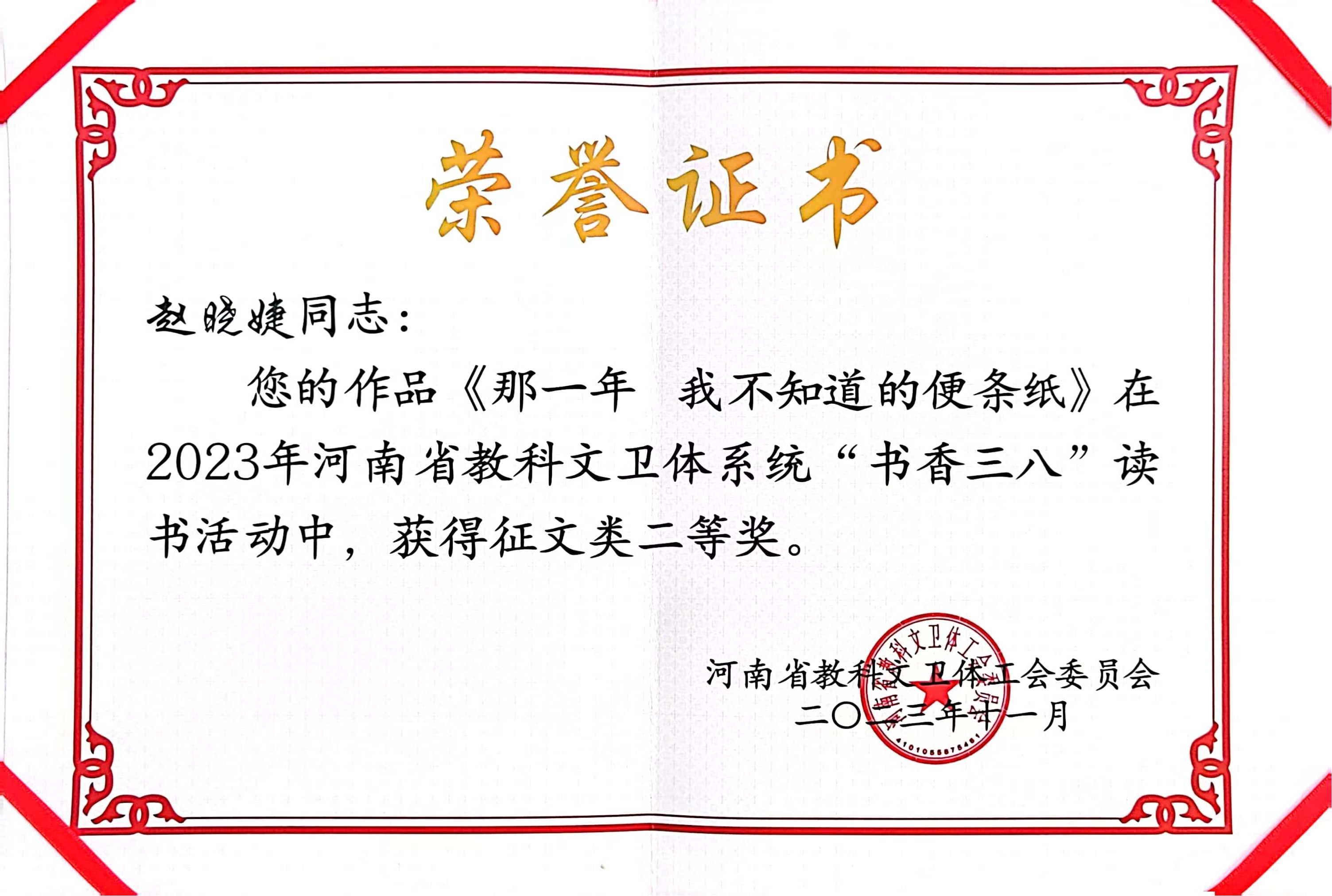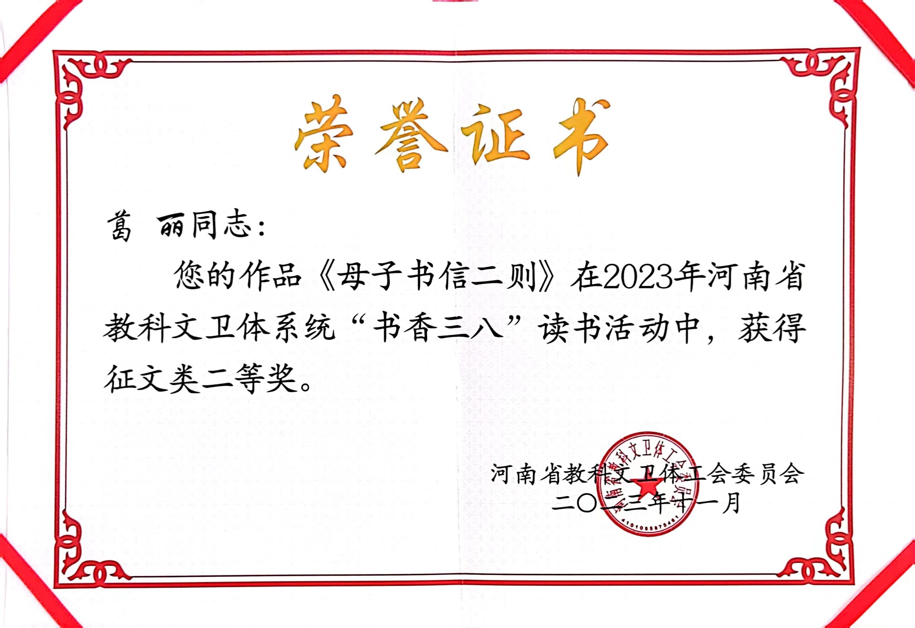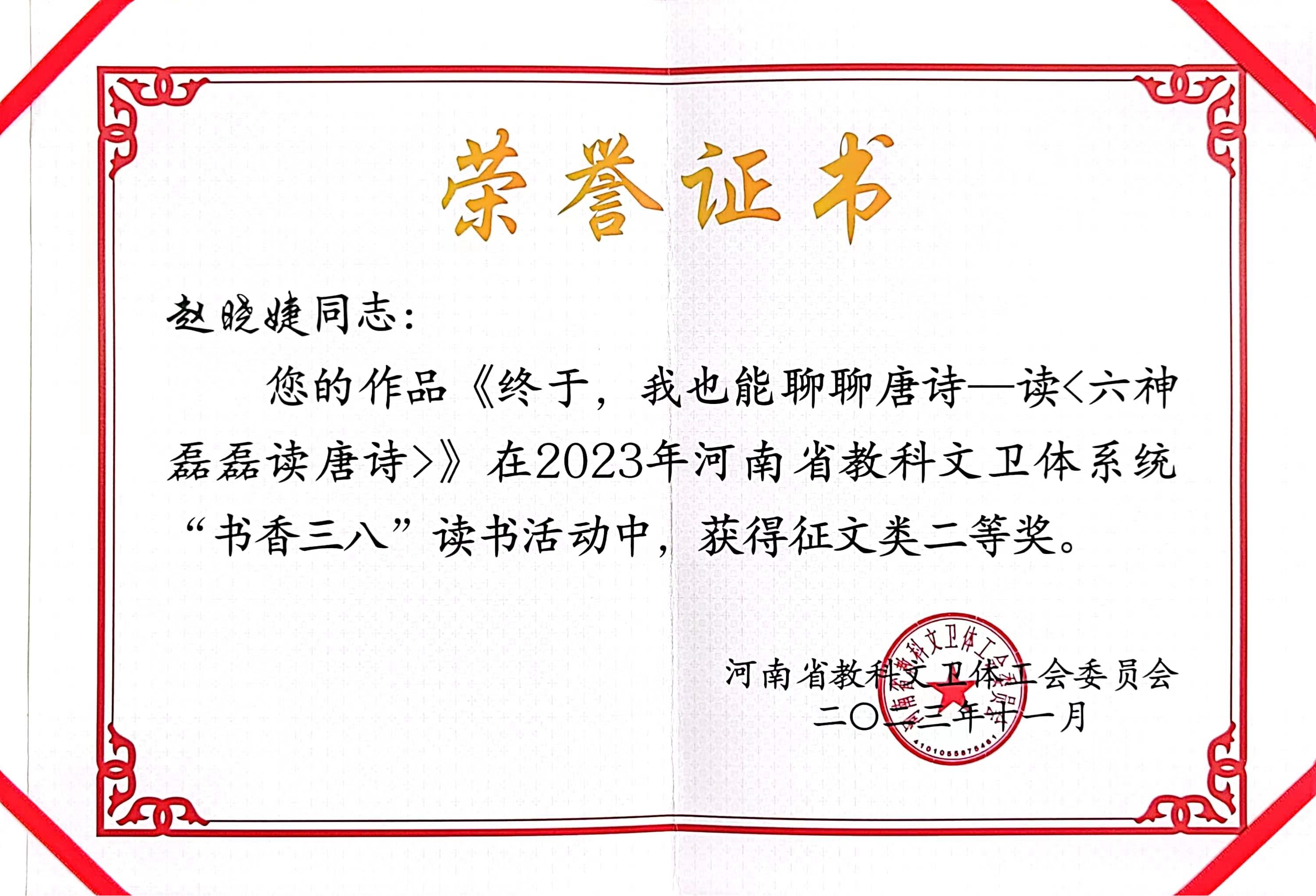 近日,河南省教科文卫体工会通报了2023年“书香三八”读书活动获奖情况,我院教师获3个二等奖,分别是赵晓婕的《终于,我也能聊聊唐诗——<六神磊磊读唐诗>》《那一年 我不知道的便条纸》,葛丽的《母子书信二则》。