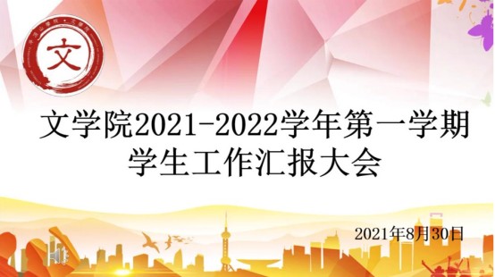 为全面总结过去一年学生工作,布置新学期学习工作,持续推进学生工作的连续性和稳定性,8月30日晚,文学院依托钉钉平台,召开2021-2022年第一学期学生工作汇报暨新学期工作部署大会。文学院党委副书记李培斌、团总支书记马继文、团总支副书记李丹阳及各年级辅导员和文学院学生党支部、团总支全体学生工作者参加本次大会。