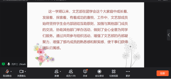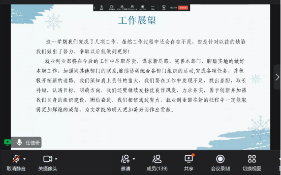 本次学生工作汇报大会的顺利召开,各部门总结了上学期工作中的收获与不足,使学生干部明确了自身的工作职责与努力方向,增进了各部门之间的学习交流。本学期学生工作者将会以更加饱满的热情参与到院系的各项工作当中,为文学院的更好发展做出积极的贡献。