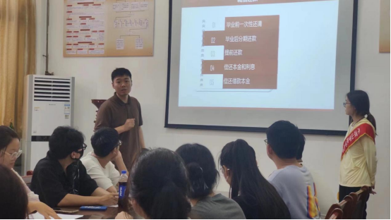 会上,张驰老师传达了学校关于助学贷款工作的相关文件精神,强调了资助工作的重要性和意义。他表示,助学贷款是帮助家庭经济困难学生完成学业的重要渠道,也是培养学生诚信意识和法律意识的重要途径。因此,学院高度重视助学贷款工作,积极采取措施推进相关工作。张驰老师从高校贷款毕业确认、毕业前一次性还清、毕业后分期还款、提前还款及本金延期偿还政策等五个方面进行了详细讲解。他结合具体案例,向同学们介绍了各种还款方式的优缺点和适用条件,并呼吁同学们诚信还款。