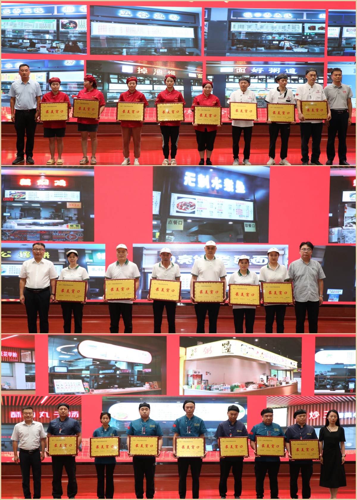 评选活动经广大师生实地参观评估、线上投票等环节,最终评选出“最美餐厅”1家,“最美窗口”21家。颁奖仪式上,与会人员共同观看了“最美餐厅、最美窗口”宣传片,侯延民为白楼餐厅代表颁发了“最美餐厅”奖牌和奖杯,相关部门负责人为白楼餐厅的“黄焖鸡”窗口、蓝楼餐厅的“五谷鱼粉锡纸花甲粉”窗口、红楼餐厅的“千里香馄饨”窗口等21家窗口颁发了“最美窗口”奖牌。