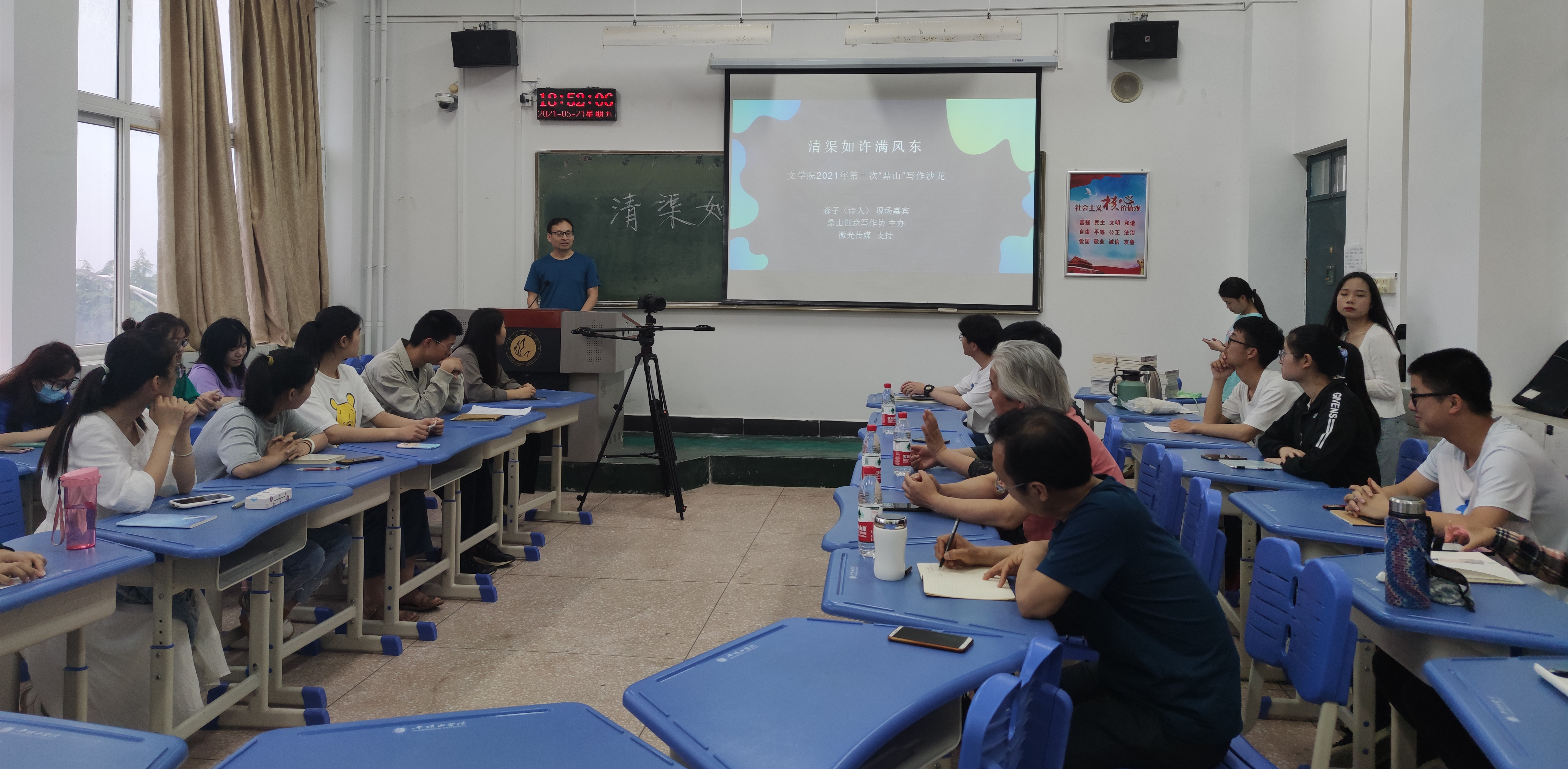 5月21日下午,清渠如许满风东——文学院2021年第一次写作沙龙在2203教室举行。按照新文科教学改革要求,本次沙龙完全由学生团队组织举办,鼎山创意写作坊负责沙龙的全程主持、会务服务和新闻采写,微光传媒负责全程摄像。著名诗人森子、文学院部分专业教师到场,与来自全校不同专业的文学爱好者20余人参加了本次沙龙。沙龙由文学院2019级汉语言文学2班学生、鼎山创意写作坊负责人代萍主持。