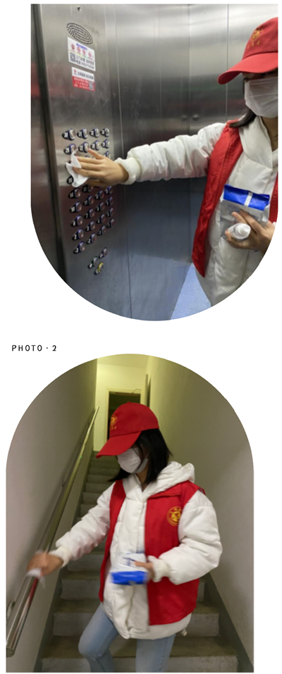 在河南省郑州市中原区红松路湖畔小城,陈卓同学主要负责对楼层楼梯和电梯等社区公共设施进行消毒。在工作中,防疫的责任感和紧迫感让她丝毫不敢懈怠,认真及时地完成社区布置的工作,真正为抗击疫情做出了自己的贡献。