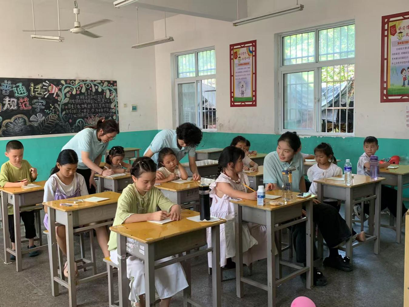 午后的阳光透过教室,文艺支教组的志愿者们有条不紊地开启写字课堂,以童趣盎然的方式带领孩子们走进汉字的奇妙世界。志愿者们手持田字格教具,巡回指导孩子们规范握笔姿势,以掌心相贴的方式传授行笔技巧。