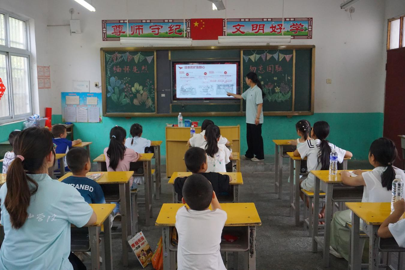 课堂上,许梦瑶精心设计趣味问答、情景模拟等互动环节,以“如果是你会怎么做”等启发式提问,引导孩子们踊跃分享所思所感,让历史教育真正走进童心。考虑到孩子们认知有限,志愿者别出心裁地准备了爱国主义教育动画纪录片——以憨态可掬的“种花家”小兔子为主角,将七七事变的烽火硝烟、抗美援朝的英雄壮歌等重大历史事件,化作孩子们易于理解的动画语言,在童趣满满的叙事中厚植家国情怀。观影结束后,课堂化作红色文艺的海洋。志愿者带领孩子们深情演唱《我和我的祖国》,稚嫩童声如清澈溪流,流淌着对祖国的挚爱;齐声朗诵《诗意中国》时,铿锵有力的童音此起彼伏,似点点星火汇聚成光。纯净的歌声与激昂的朗诵声在校园上空回荡,为这座乡村小学注入了蓬勃的爱国力量。