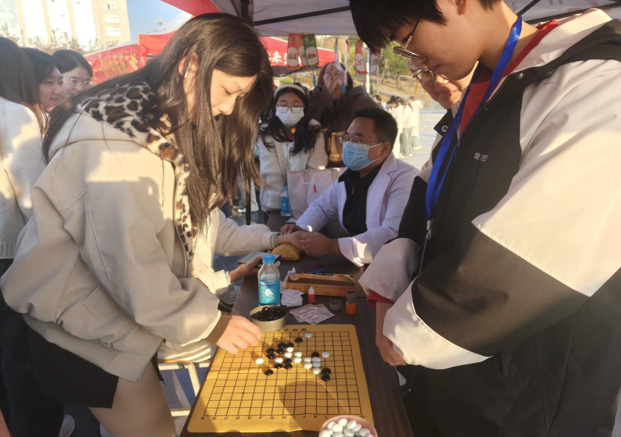 活动现场设有中医健康咨询、中药辨识、养生茶饮、文创DIY、汉服互动、导引术研习六大主题板块,融入五行对弈、识药闯关、投壶竞赛等趣味玩法。活动当天的体验街里不仅有专业医师答疑解惑、中药材标本直观展示,还有养生茶饮试喝、中药香囊自制等沉浸式体验。为贴合传统文化氛围,文学院霓裳汉服社的同学们身着优雅的汉服,站在展示台前,为参观咨询的师生详细解答;平西棋社的同学们现场与师生同玩五子棋,让大家对弈闯关、识药学技。其间,医学院的专业老师还为现场师生带来八段锦、五禽戏快闪教学,让养生知识落地实操。师生参与活动均可领取打卡卡片集章,完成四项及以上任务即可参与抽奖。
