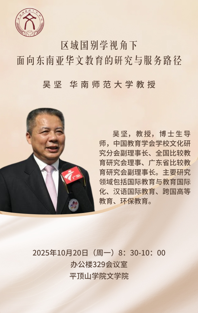 “鼎山讲坛”系列讲座预告 | 10.20 吴坚:区域国别学视角下面向东南亚华文教育的研究与服务路径