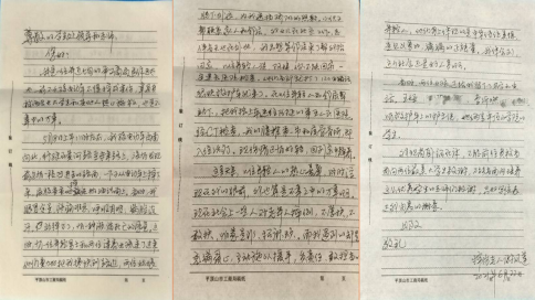 后经了解得知,5月8日中午,谢凤莲老人骑电动车行驶在黄河路至未来路途中时不慎摔下并瘫倒在地,受伤较为严重。路过的文学院学生王娅、李沂燃见状,主动伸出了援助之手。由于路上车辆较多,为避免二次伤害,两位同学将老人小心地从路边扶至安全地带。看到老人满脸流汗、呼吸有些困难,情急之下二人脱下外衣帮老人遮挡骄阳的照射,同时拨打120并联系老人的亲属。救护车来后,二人看到老人得到妥善救助后才放心离开。两位学生的善举让老人心存感动,事后经过打听,老人得知向她提供帮助的是平顶山学院的学生,于是在病床上亲自写下感谢信表达对王娅、李沂燃两位学生的由衷谢意。
