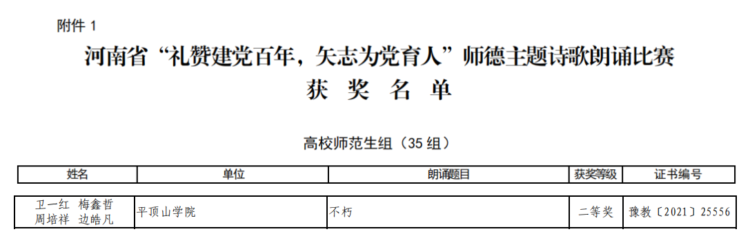 近日,河南省教育厅发布《关于公布“礼赞建党百年,矢志为党育人”诗歌朗诵比赛、师德教育主题征文和师德师风优秀案例评选结果的通知》(教师〔2021〕289 号),文学院学生卫一红、梅鑫哲、周培祥、边皓凡的《不朽》获得河南省“礼赞建党百年,矢志为党育人”诗歌朗诵比赛高校师范生组二等奖(豫教〔2021〕25556),文学院教师冯硕的《奶奶说》(豫教〔2021〕25601)获得河南省“礼赞建党百年,矢志为党育人”师德教育主题征文高校教师组一等奖,杜彬彬的《你把该做的事情做好》(豫教〔2021〕25704)、赵婕的《大爱无声》(豫教〔2021〕25705 )获得二等奖。