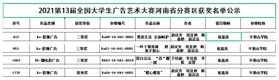 近日,全国大学生广告艺术大赛河南省分赛区组委会公布了第13届全国大学生广告艺术大赛河南省分赛区获奖名单,文学院教师崔嘉美指导,2018级戏剧影视文学专业学生赵庆安、田亚迪、陈春妙、袁洁洁摄制的《奥美生活 全面呵护》《叶子很清新 熬夜不担心》《“橙心橙意”》分获影视广告类二等奖、三等奖、优秀奖;崔嘉美指导,2018级戏剧影视文学专业学生于印超、李佳意、李松、宋雯摄制的《夏日沉沉 “苏”醒一刻》获微电影广告类三等奖。