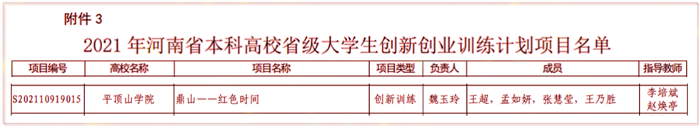 9月29日,河南省教育厅发布《河南省教育厅关于公布2021年大学生创新创业训练计划项目名单的通知》,由文学院教师李培斌、赵焕亭指导,2017级汉语言文学专业学生魏玉玲,2018级汉语言文学专业学生王超、张慧莹,2019级汉语言文学专业学生王乃胜,2019级戏剧影视文学专业学生孟如妍共同申报的《鼎山——红色时间》获批2021年河南省本科高校省级大学生创新创业训练项目立项。