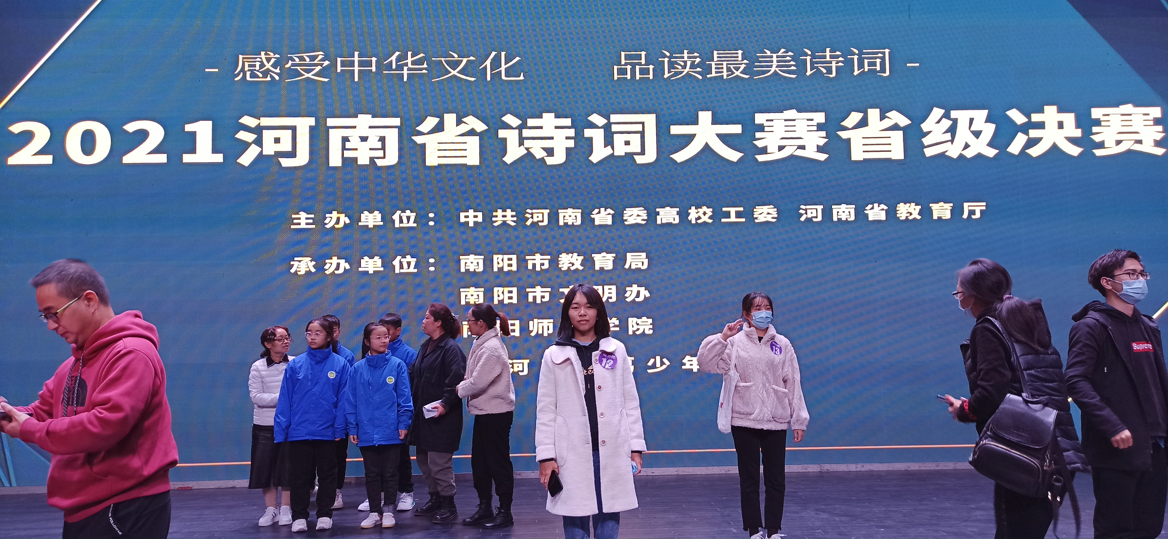 农历暮秋,金风送爽。10月20日,2021河南省诗词大赛省级决赛在河南省南阳市拉开帷幕,来自全省各地600余名晋级选手齐聚南阳大剧院,共享诗词盛宴。由我校文学院闫真真任辅导老师、2020级汉语言文学1班学生王镜婷组成的平顶山学院代表队参加了本次比赛。在大学组竞赛中,王镜婷获得2021河南省诗词大赛省级决赛一等奖,并进入中央广播电视总台中国诗词大会面试选拔赛。