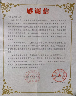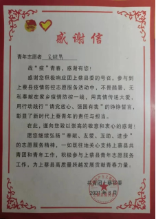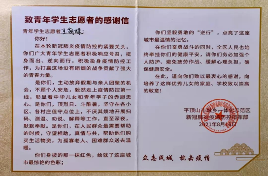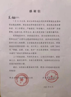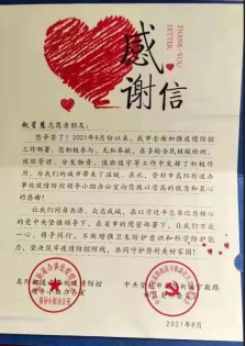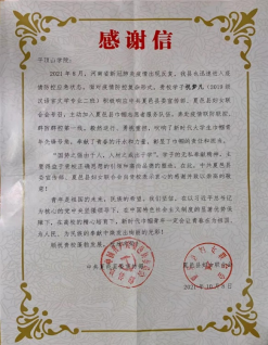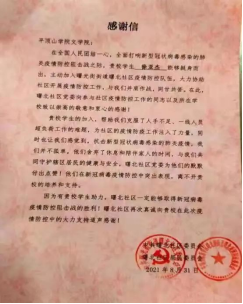 自本学期开学以来,文学院陆续收到中共内黄县委、中共上蔡县委、中共夏邑县委、中共郏县县委、中共下汤镇委员会、中共方岗镇委员会和各地区街道办事处等各级单位、组织的来信感谢,对我院学子暑期参与防洪、抗疫志愿活动给予高度赞扬,对平顶山学院“三全育人”成果给予高度肯定。