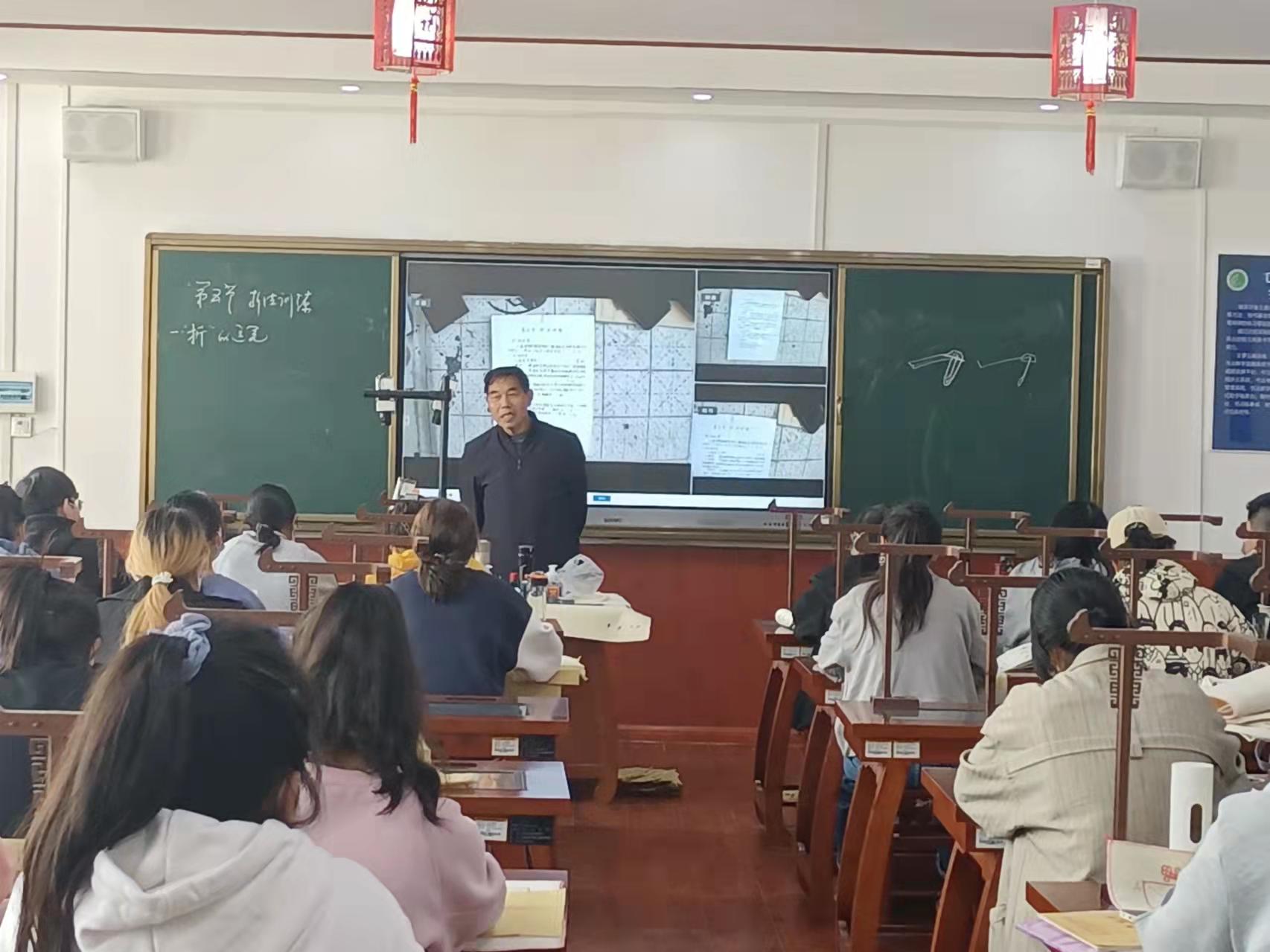 4月6日上午8:00,艺术楼502教室里,来自2021级汉语言文学1班的50余名学生已正襟危坐,拿起毛笔,准备一展身手;黑板前,退休教师郑黎阳打开了书法展示台,调好墨汁,铺平宣纸,一切就绪,准备上课。与往常一样,文学院第二课堂“毛笔书法训练与创作”课程的第六讲准时开始了。