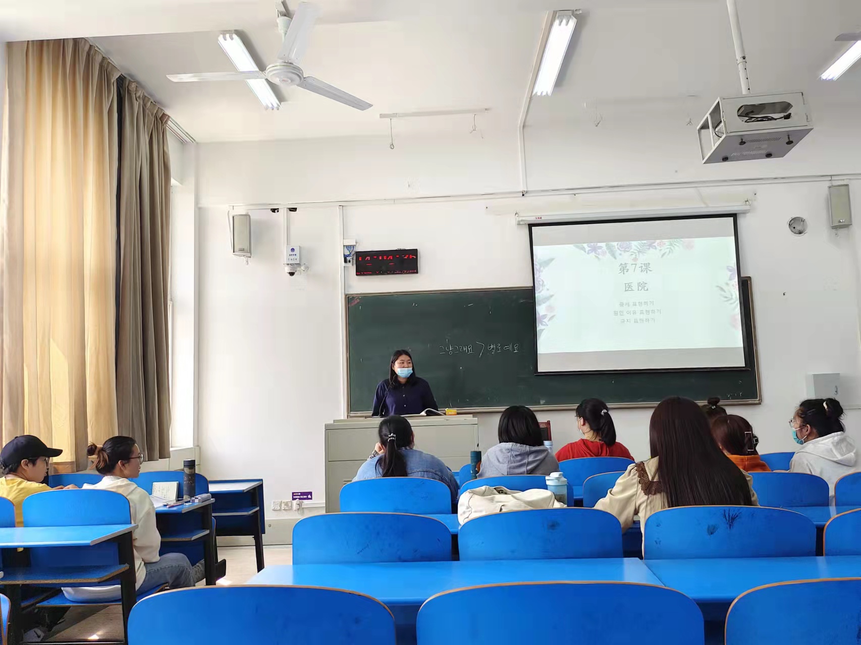 学习一门外语,一定要有场景设置和情景还原,学习者会在情境模拟中练习掌握该语言的实际用法。阴宝娜老师模拟了病人和医生的对话场景。她强调,韩国医生在接待病人时通常会问“你从哪里来”“你怎么来的”“你得的什么病”这三个问题。为让同学们更形象了解韩语语境,她展示了“咳嗽”一词在韩国人日常语用中的多种表现形式。课程最后,阴宝娜老师引导同学们运用单词的适当形式进行会话练习,让大家在实景练习中提高口语表达能力。一堂生动而又情景交融的语言课从始至终充满了欢声笑语,融洽的师生关系贯穿了整个课堂。