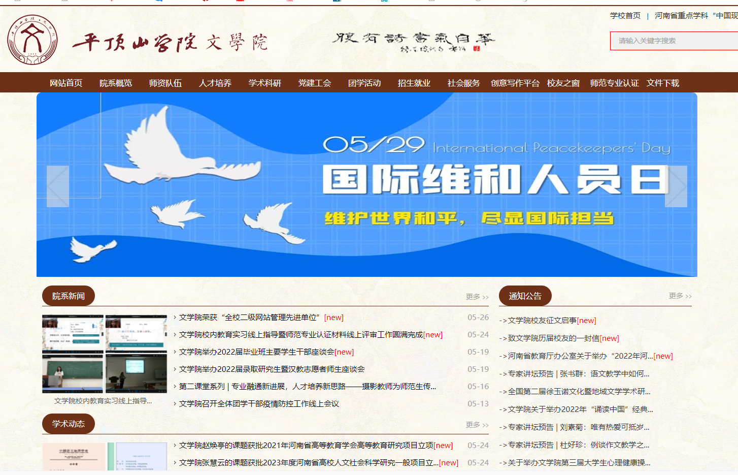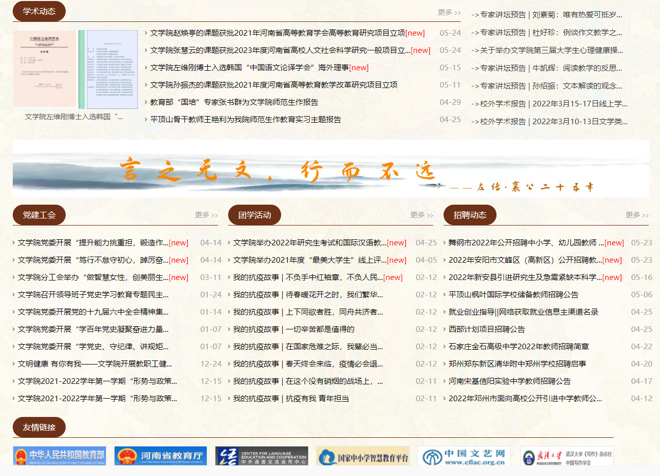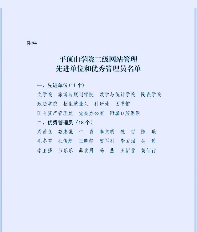近日,校党委宣传部印发《关于表彰2022年二级网站管理先进单位和优秀管理员的决定》(平学院宣文〔2022〕8号),对全校二级网站管理先进单位、优秀管理员予以表彰。在此次表彰中,文学院被评为“全校二级网站管理先进单位”,周萧良老师荣获“平顶山学院二级网站优秀管理员”称号。