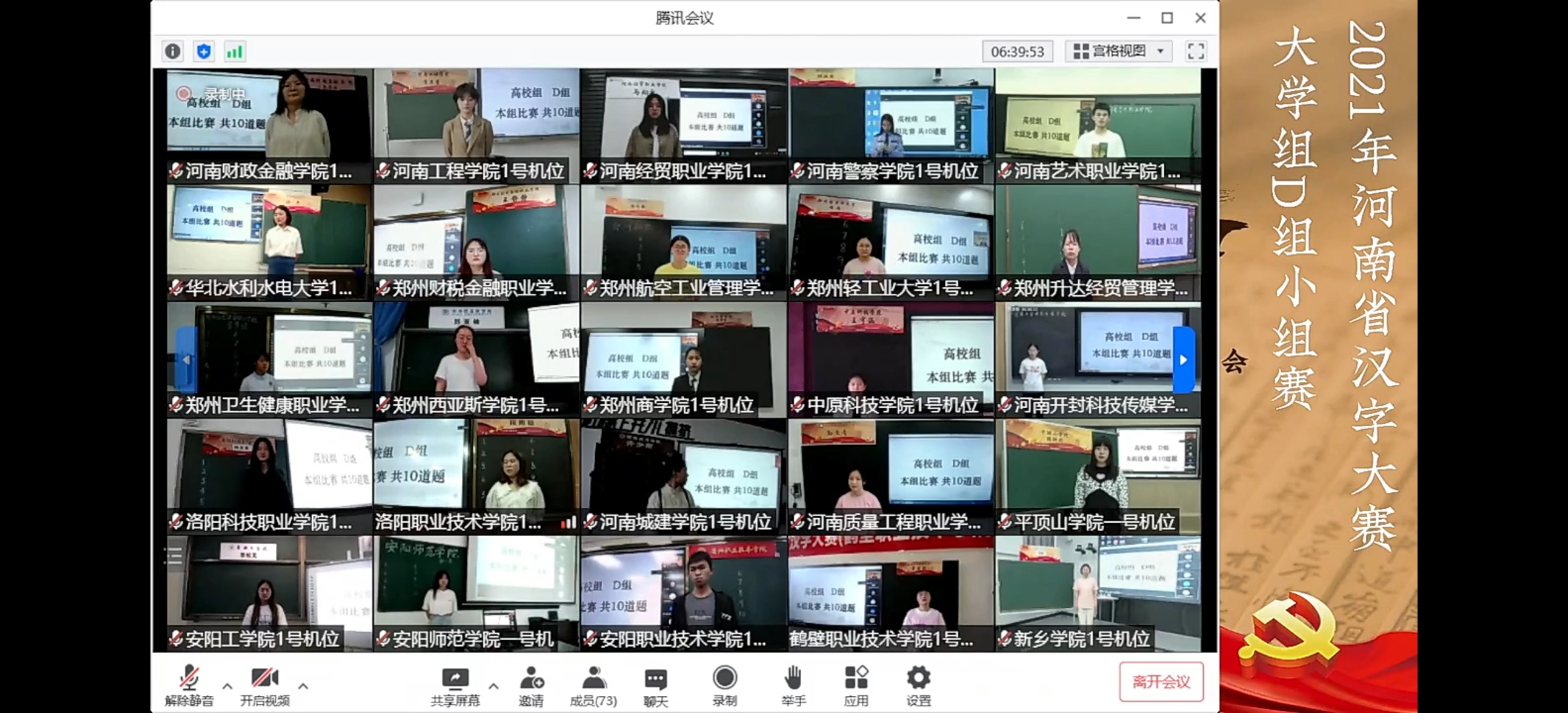 因疫情影响,2021年汉字大赛延期至2022年5月19日举行,采用“小组赛+线上总决赛”的方式,由赛事组委会协同各个参赛学校进行线上直播。本次比赛题目分为听写题、语境题、溯源题等,从成语词语、经典传统文化知识、词语音形义等多方面考察选手的知识储备、情景应变能力和规范书写能力。我校参赛同学前期做足了准备,她们冷静沉着,稳定发挥,以淡定娴熟的表现应对每一道题,向大家展示了扎实的文字功底。