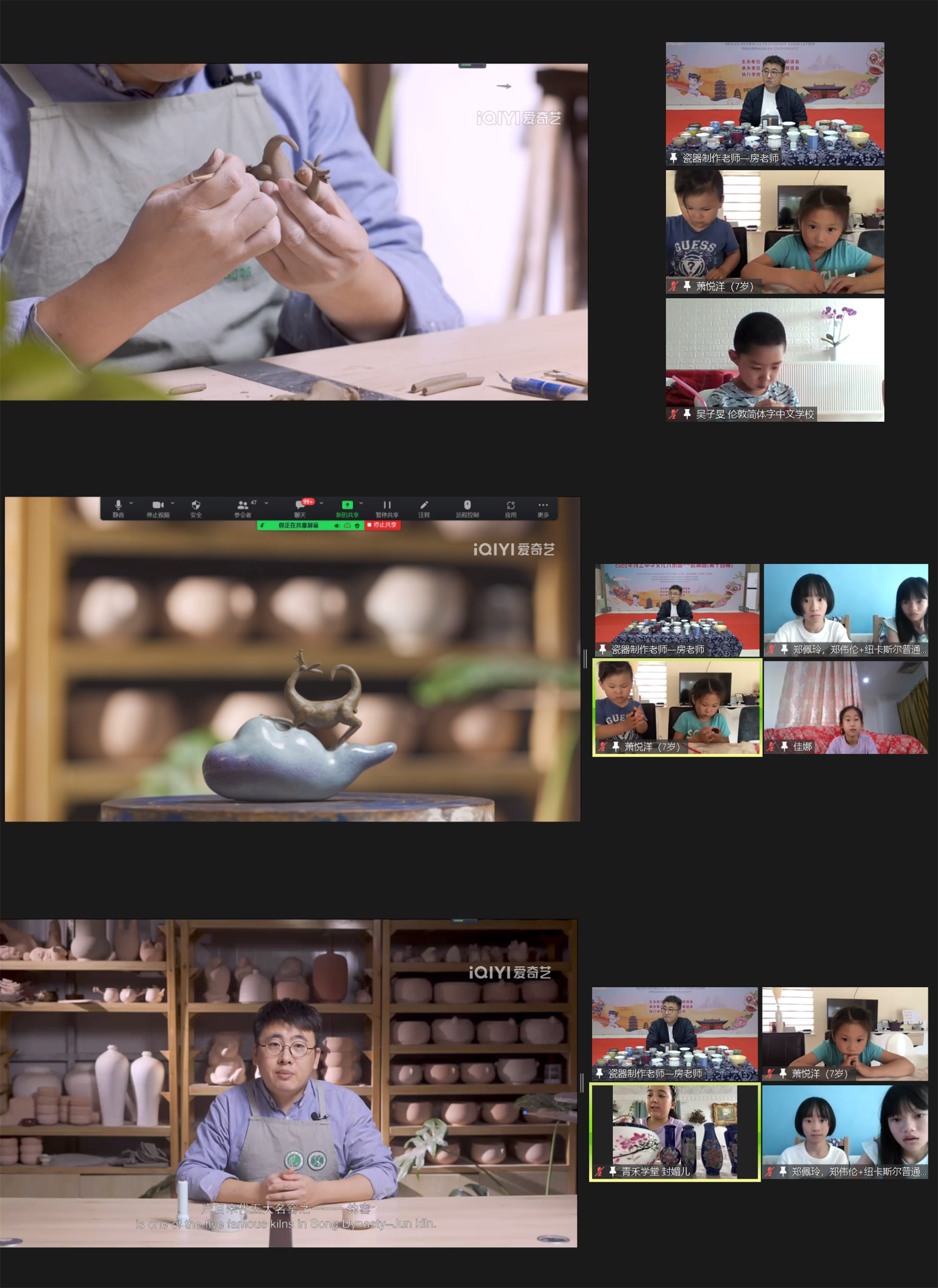瓷器是火与土的共舞,饮茶是人与器物的对话,清香从古陶中透出,倾一盏,不染尘色,气散而愈香,吹开雪沫,品人间有味,赏丰富陶瓷。河南省陶瓷设计艺术大师、我校陶瓷学院教师房峰用自己丰富的藏品和多年制作陶瓷的经历,为欧洲华裔青少年讲解了中国的陶瓷艺术,以及不同材质陶瓷的用途。学员们沉浸于陶瓷制作的课堂中,隔着屏幕给老师展示自己家的各种瓷器,有的还跟着老师录制的视频尝试自己制作。