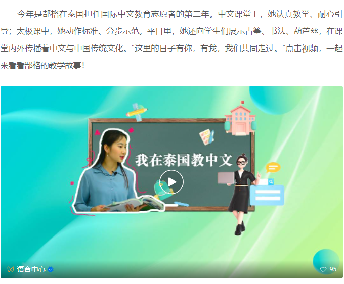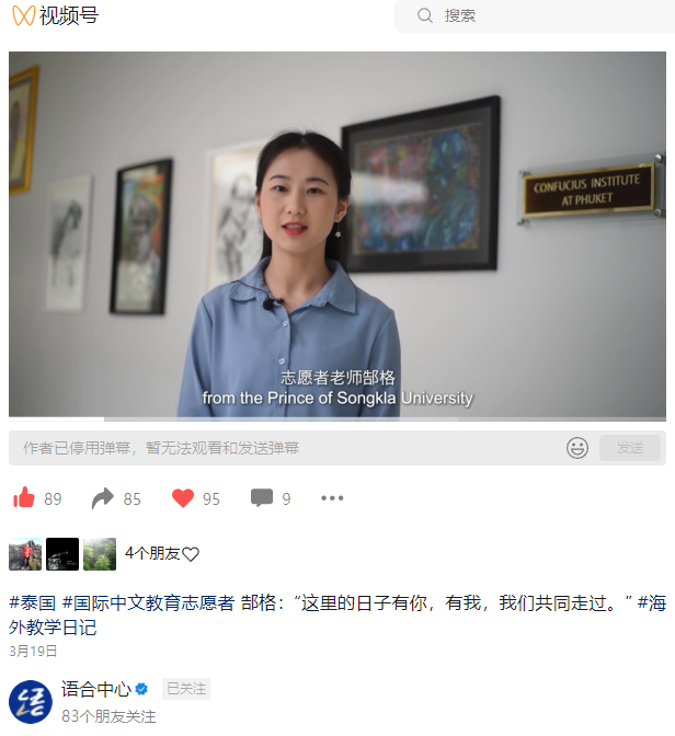 3月19日,教育部公众号《语合中心》发布了《海外教学日记 | 我在泰国教中文》微视频,用影像讲述了我院优秀毕业生郜格在泰国宋卡王子大学担任志愿者的故事。郜格除了向泰国学生们讲授汉语,还向他们展示了汉字书法书写技巧,中国古筝、葫芦丝的演奏技法,在课堂内外传播着中文与中国传统文化,用实际行动讲好中国故事。