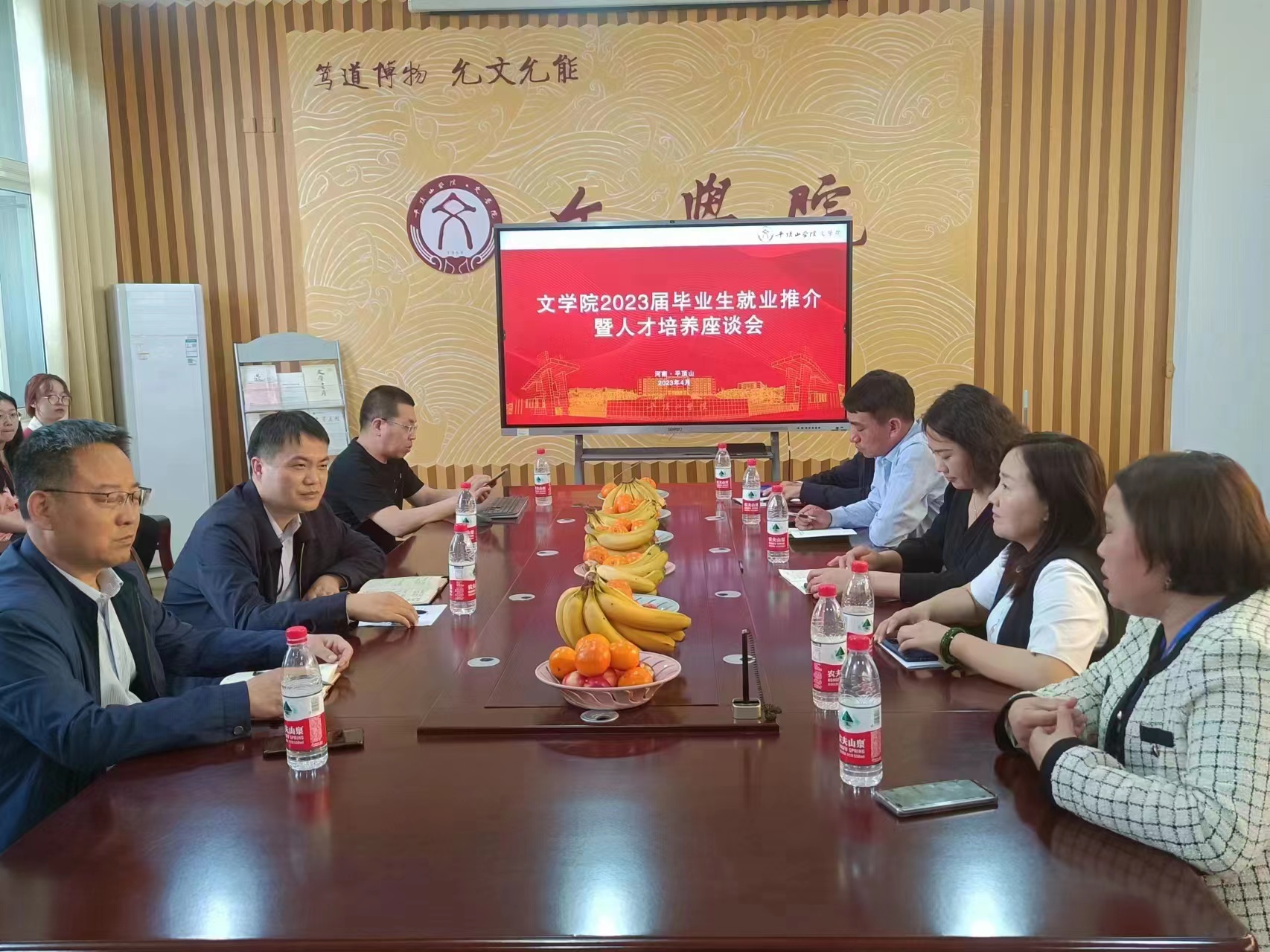 申自强对各用人单位负责人的来访表示欢迎。他简要介绍了文学院的历史沿革、教学师资、办学成果及在办三个专业的人才培养优势特色。他表示,文学院人文底蕴深厚,坚持立德树人根本任务,坚守教育初心,学生专业技能和综合素质好,毕业生具有较强的发展潜力。他希望与在座的用人单位建立长期交流合作机制,在人才培养、学生就业等方面深度合作,推动院校双方资源共享、优势互补,更好服务学生成长成才。