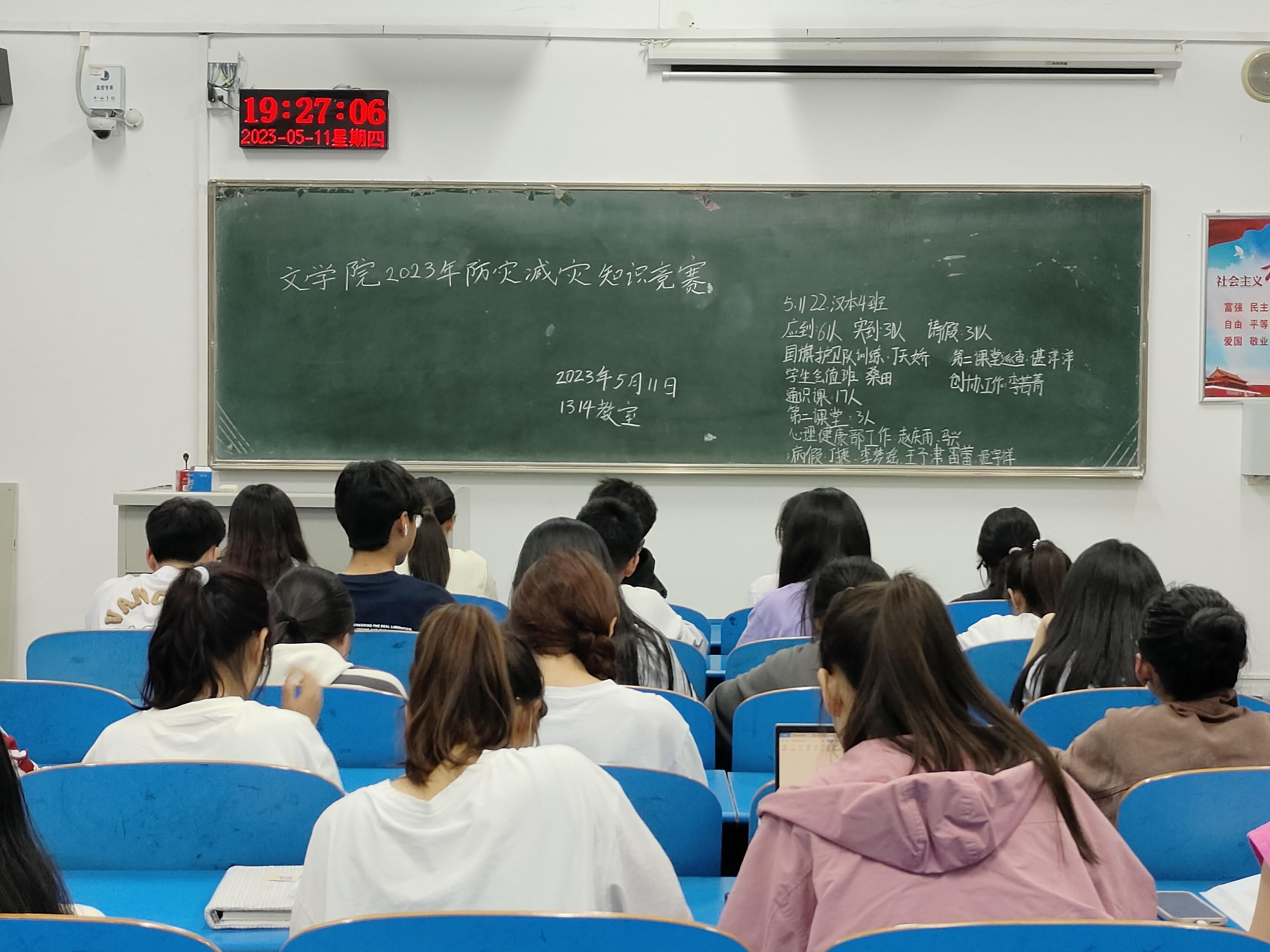2023年5月12日,是第14个全国防灾减灾日,今年的主题是“减轻灾害风险 守护美好家园”。为帮助同学们了解防灾减灾工作的重要性,增强面对灾难时的自救能力,5月11日晚,我院利用晚自习时间组织各年级学生开展2023年防灾减灾知识竞赛。本次活动由文学院团学会学习部承办。