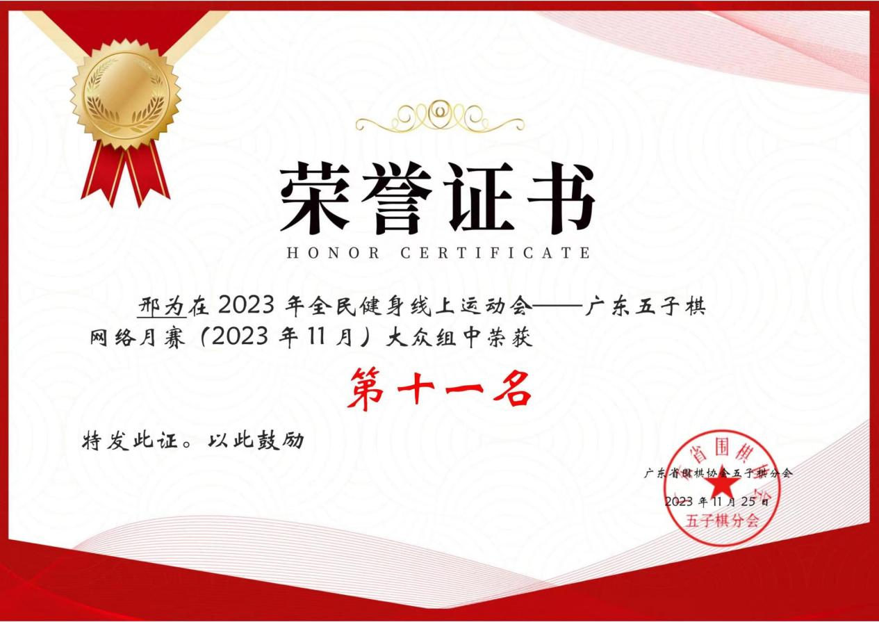 11月25日13:30,广东五子棋网络月赛(2023年11月)在五林五子棋APP上如期开赛,我院平西棋社成员邢为参赛,并以总分4.5分获个人第十一名。