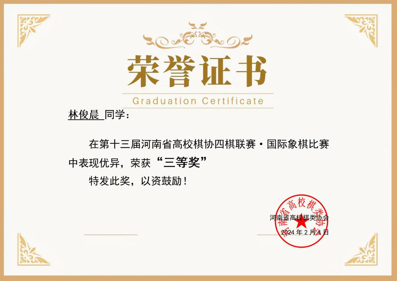 近日,河南省第十三届高校四棋联赛·国际象棋比赛在线上进行,我院平西棋社成员林俊晨以积分6分排名第五,荣获三等奖。