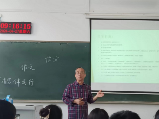 4月27日上午,全国优秀教师、我院特聘行业教师张贵斌应邀走进“中学语文课程与教学论”的课堂,就中学语文作文教学难点与操作技巧,进行专题授课。该课程任课教师彭月星、文学院2022级汉语言文学专业3班全体同学一起听课。