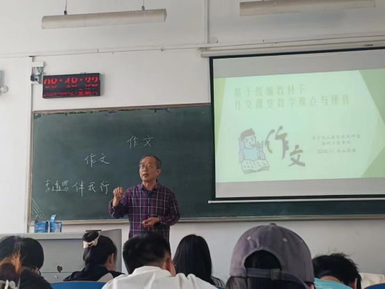 以章回体小说《西游记》中孙悟空的成长经历为例,张贵斌老师告诉同学们不仅要学会自己写作,更要学会指导学生写作。张老师说,中学师生都知道“语文学习有三怕”:一怕周树人,二怕文言文,三怕写作文。这就说明写作有些难,作文教学也有些难。他通过剖析“难”的繁体字形体引导大家思考“写作难在哪里”,并告诉大家要结合生活实践搞教学,要提升自身教学能力来提高学生写作水平。张老师结合作文实例剖析了套路对于写作的影响,他指出,中学语文教师要教导学生用放大镜看待生活中的素材,放大灵感,引导学生进行角色互换,多多体验。针对作文“难教、难写、难改”的问题,张老师建议,同学们要依照课标和教材编写指向,做到详批细改,在批改中提升学生写作能力;要把写作作为独立专题,抓住典型材料;要读写结合,以阅读配合写作,以写作巩固阅读。张老师告诫同学们,作为准教师,大家要懂得“打铁还需自身硬”的道理,科学合理制定真实可行的写作教学规划,掌握智能技术协助日常教学工作。