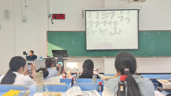 “丁零零……”5月9日16:00,图书馆L208教室里,伴随着一阵清脆的上课铃声,来自文学院各专业的30余名同学已经备好纸墨,正襟危坐,等待上课。讲台上,授课教师郑黎阳也早已准备就绪。像往常一样,文学院第二课堂“毛笔书法训练与创作”的第五节准时开始了。