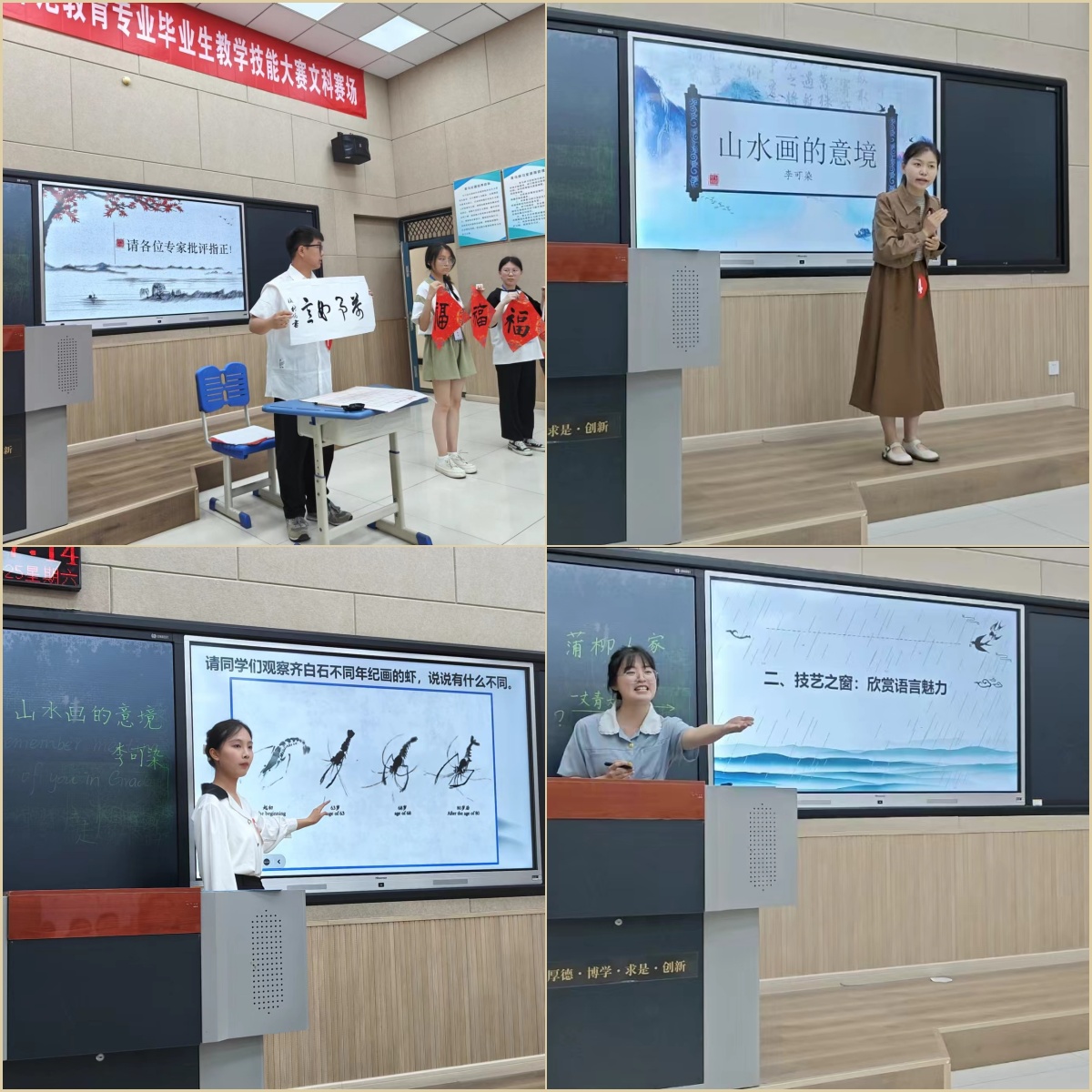 此次大赛分预赛和决赛两个阶段。文学院根据大赛要求,于5月7日日组织了院级预选赛,2021级汉语言文学、汉语国际教育专业28名同学报名参加,最后有13名选手晋级决赛。5月25日的决赛分为文科、理科、艺体、学前四个赛场,分别在图书馆、艺术楼和体育馆同时举行,比赛内容包含微型课、答辩、才艺展示三个环节。来自文学院的13名选手参加了文科赛场比赛,他们朝气蓬勃、声情并茂、讲授生动,从板书能力到教育教学功底再到语言表达能力,全面展示了文学院师范生扎实的教学基本功。
