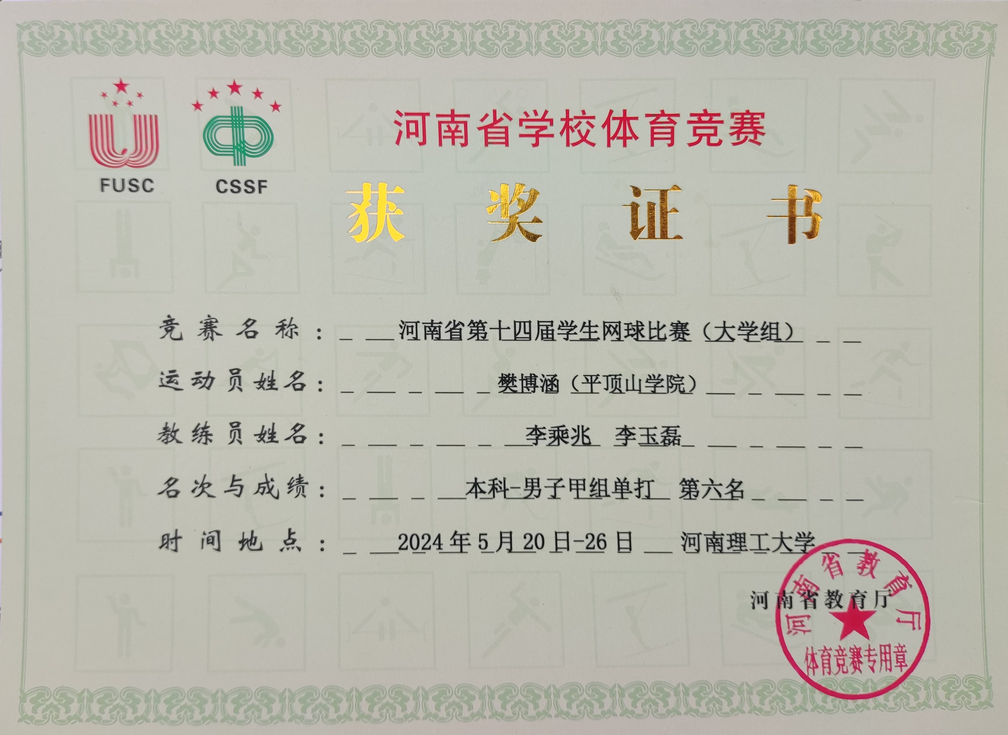 5月26日,河南省第十四届学生网球比赛在河南理工大学落幕。我院2020级汉语言文学专业学生樊博涵参赛,获得大学组第六名。
