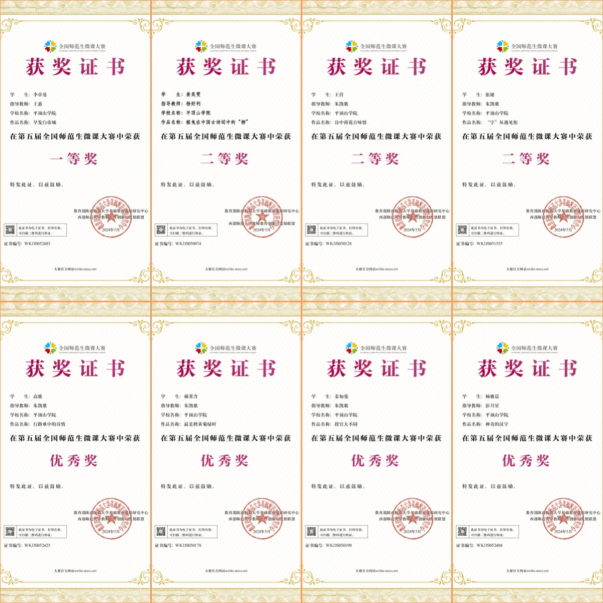近日,第五届全国师范生微课大赛获奖名单揭晓,我院2021级汉语言文学专业李卓曼获一等奖,姜昊雯、王营、张婕获二等奖,高歌、郝茉含、姜如蔓、杨雅晨获优秀奖,指导老师为朱凯歌、彭月星、王惠、杨好利。