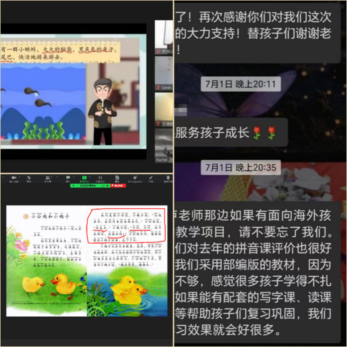 文学院国际中文教育团队受美国亚裔青少年协会会长李薇所托,为来自该协会的11位小选手进行朗诵辅导。课程辅导以线上会议辅导和微信指导相结合,从3月17日开始,为期八周,共计16课时,线上会议让学生了解作品、加深印象,微信指导帮助学生巩固知识、改善发音。指导教师根据大赛规则制定了详细的辅导计划,从选择朗诵作品,到了解作品内容,再到针对性朗诵辅导,分三步帮助选手逐步提高朗诵能力。两位指导老师帮助参赛选手选择参赛作品,讲解作品的深层内涵,演示融入思想感情的技巧。他们还借助这些优秀的朗诵作品向学生讲述了作品中所蕴含的中国传统文化知识,加深学生对中文的热爱。经过一个多月的辅导,参赛选手无论是作品的熟悉程度还是情感表达与融入,都有了明显的进步。