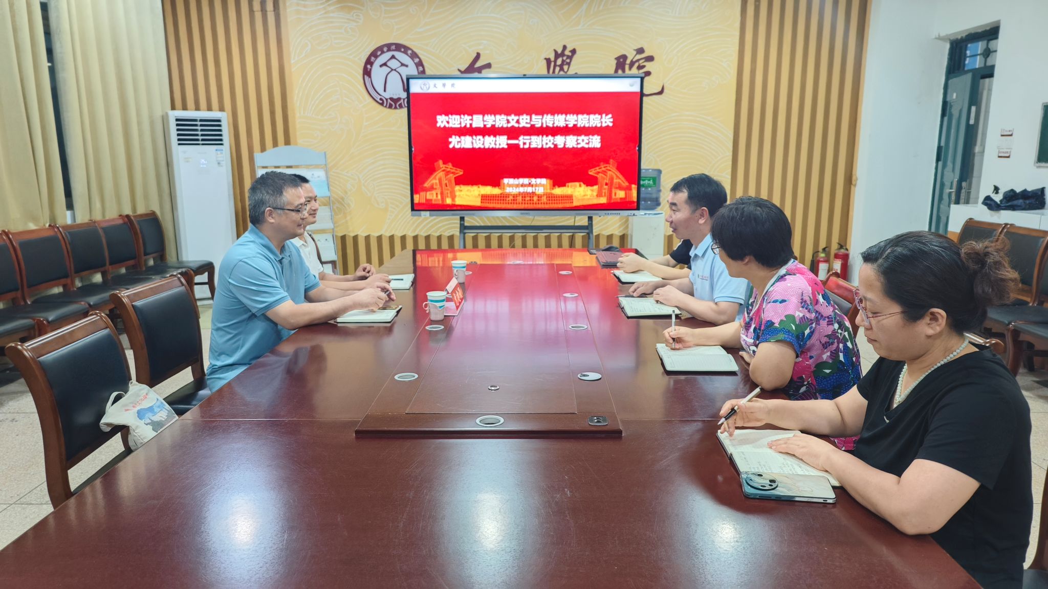 尤建设介绍了许昌学院文史与传媒学院的发展特色和建设思路,肯定了我院专业实践教学的建设效果,并就实践教学路径、本科生师范专业技能培训、研究生联合培养等进行深入交流。