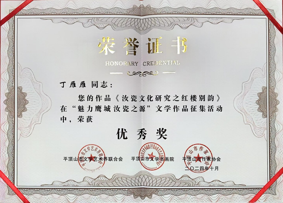 近日,“魅力鹰城,汝瓷之源”文学作品征集活动评审结果揭晓,我院2021级汉语言文学专业丁雁雁的文章《汝瓷文化研究之红楼别韵》获优秀奖。