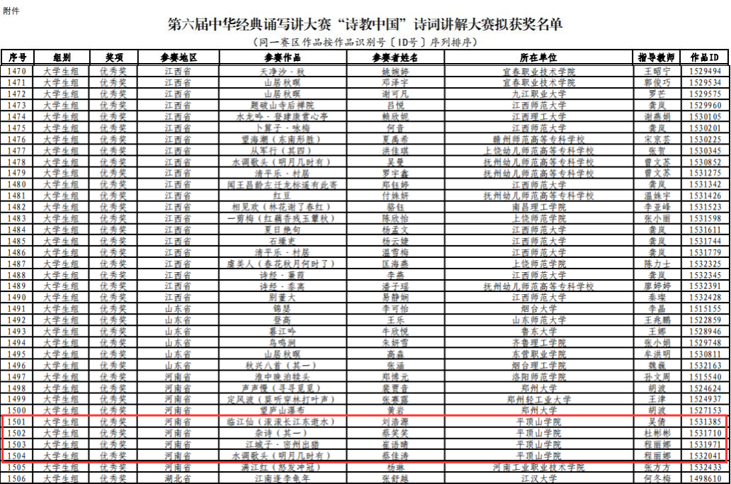 近日,中华经典诵写讲大赛执委会公布了第六届中华经典诵写讲大赛“诗教中国”诗词讲解大赛获奖结果。我院教师杜彬彬、程丽娜、吴倩指导,文学院学生蔡笑笑、崔语晴、蔡佳涛,体育学院学生刘浩源获大赛优秀奖。
