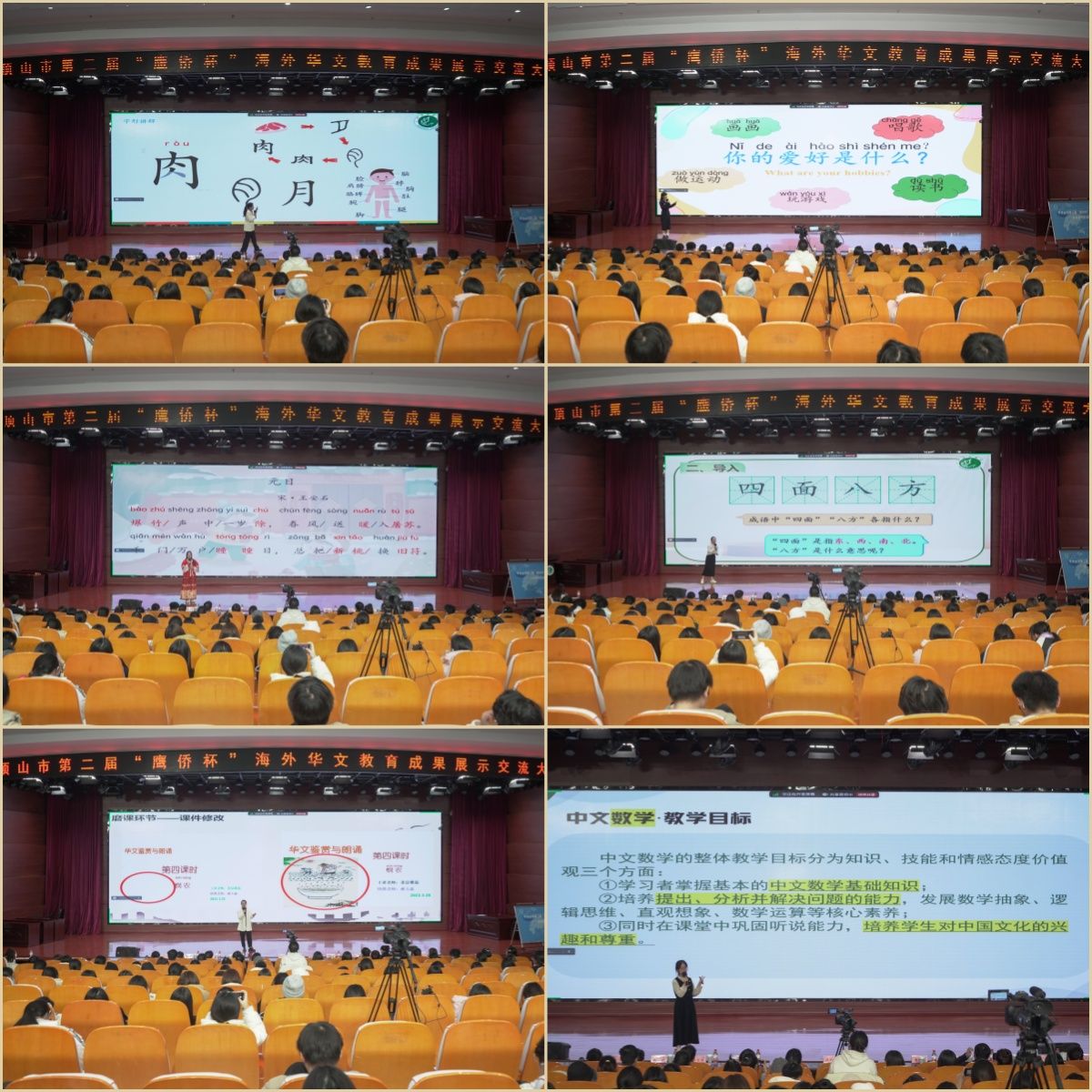 随后,获奖志愿者代表、来自我院汉语国际教育专业的学生黄馨、郭鲁豫、张雪莹、刘凡语、裴喆馨蕊、夏怡晴分别以课件、微课、案例的形式,结合教育实践,进行了华文教育中的语言教学、文化教学等成果展示,充分展现了我院学生在海外华文教育志愿服务实践中良好的教学设计能力、课堂把控能力和文化交流能力。