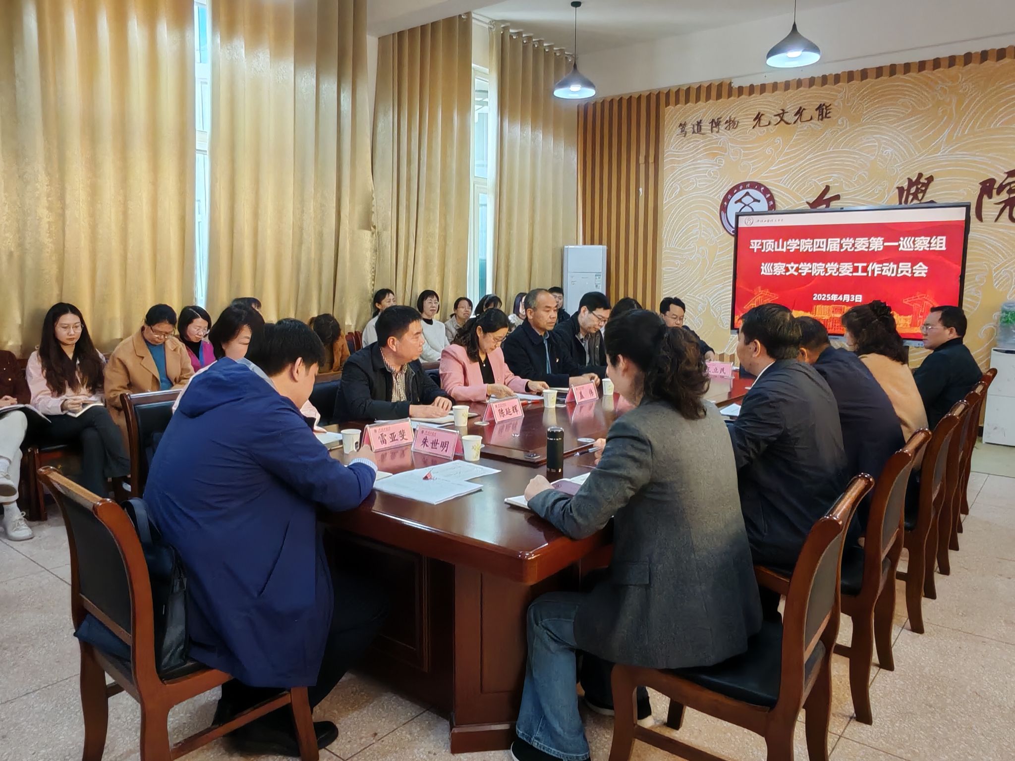 根据学校党委巡察工作安排,4月3日下午,四届党委第一巡察组巡察文学院党委工作动员会在一号楼1301会议室举行。会前,党委第一巡察组组长盖伟主持召开与文学院党委书记申自强和院长孙振杰的见面沟通会,通报了本轮巡察工作的任务和要求。会上,党委第一巡察组组长盖伟作了动员讲话,文学院党委书记申自强主持会议并作表态讲话。校纪委副书记王耀先、党委巡察工作办公室副主任陈延辉、巡察组全体成员、文学院全体教职工和学生代表50余人参加了动员会。