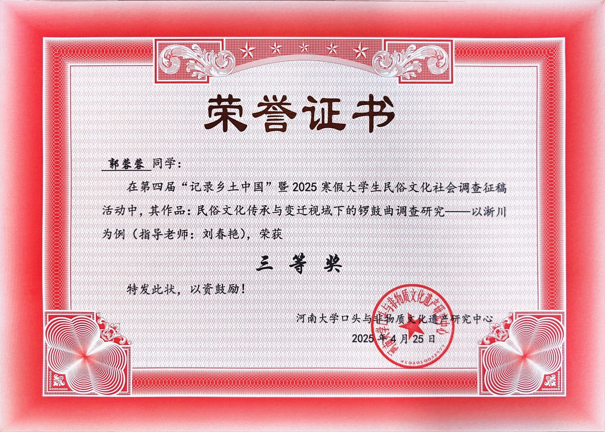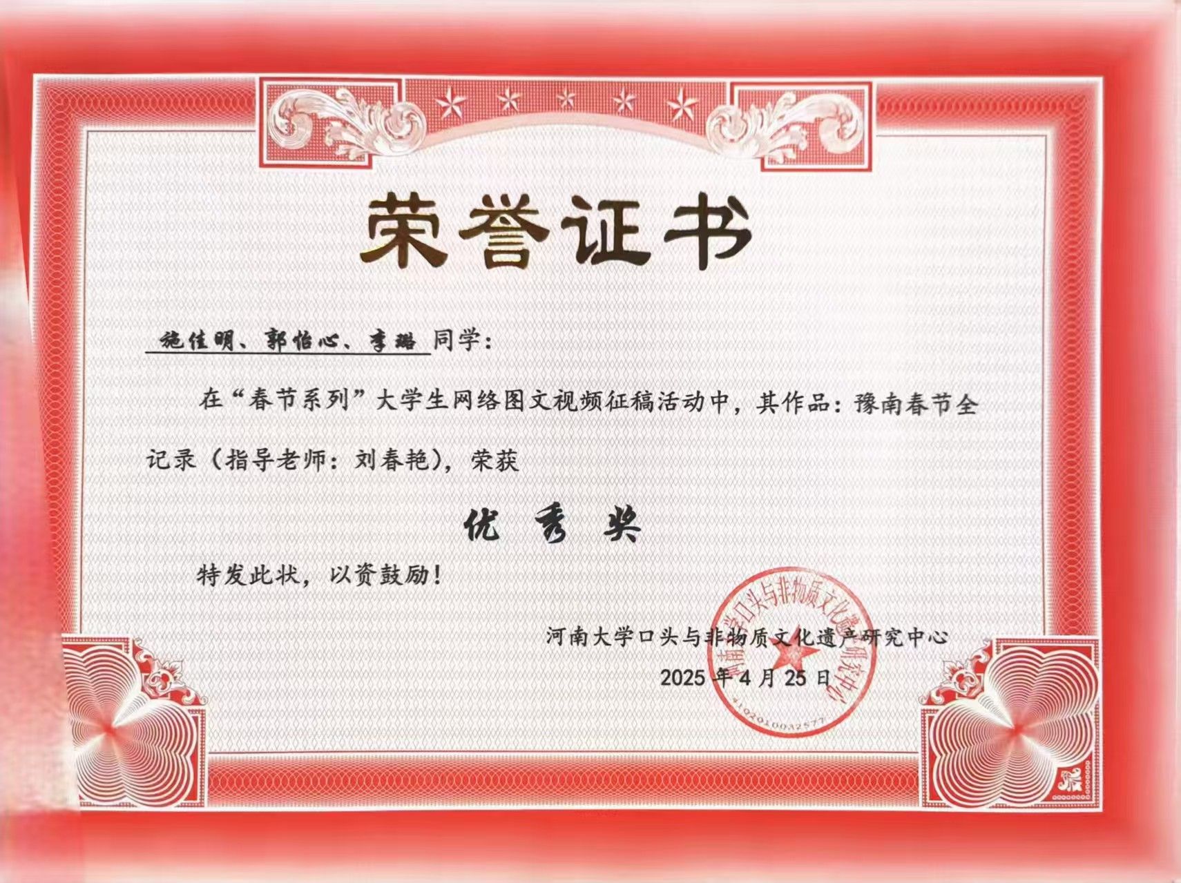 近日,第四届“记录乡土中国”暨2025寒假大学生民俗文化社会调查征稿活动公布获奖结果,民俗文化调查赛道一等奖13名,二等奖27名,三等奖37名,优秀奖50名;“春节系列”视频赛道一等奖2名,二等奖4名,三等奖7名,优秀奖9名。我院2022级汉语言文学专业学生郭蓉蓉的文章《民俗文化传承与变迁视域下的锣鼓曲调查研究——以淅川为例》获民俗文化调查赛道三等奖,2024级汉语言文学专业学生施佳明,汉语国际教育专业学生郭怡心、李璐的视频《豫南春节全记录》获“春节系列”视频赛道优秀奖。