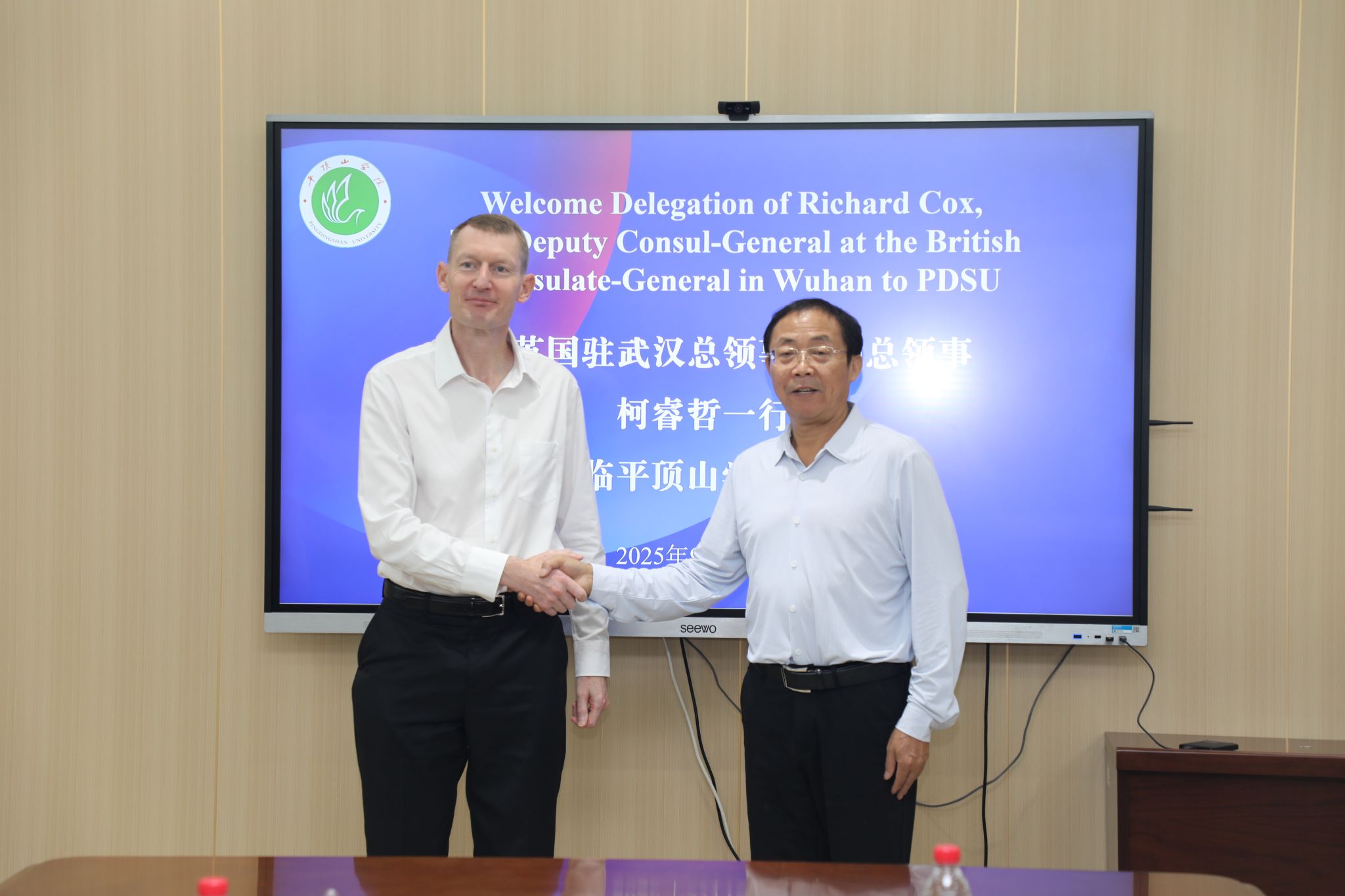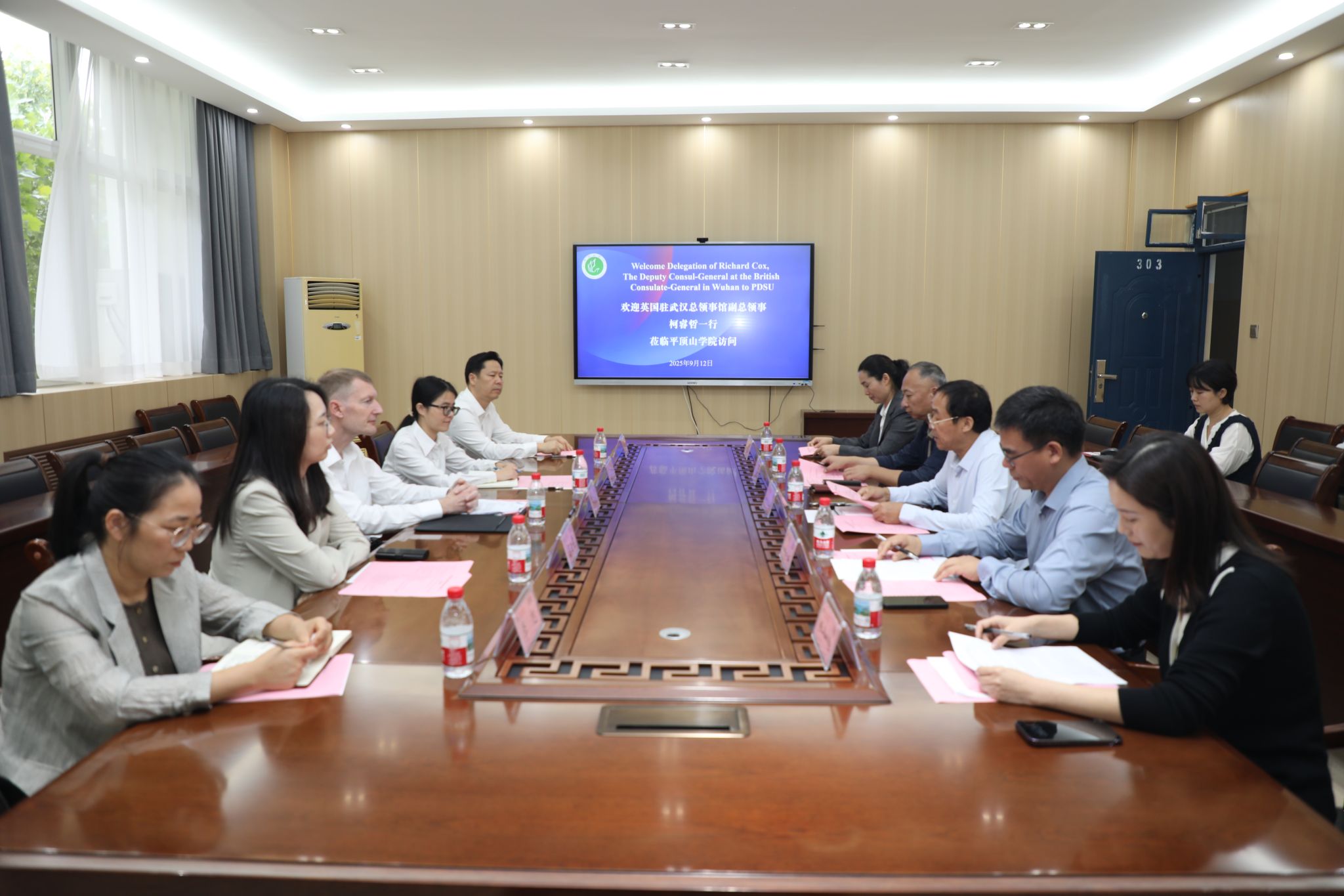 9月12日上午,英国驻武汉总领事馆副总领事柯睿哲(Richard Cox)、河南省委外事办公室欧美处三级主任科员高云鹭、平顶山市委办公室副主任、市委外事办公室副主任曹锦川等一行莅临我校访问。我校在办公楼303会议室举行欢迎仪式,副校长于长立,体育学院院长王继强,文学院副院长王惠参加。仪式由国际交流与合作中心主任王雁冰主持。