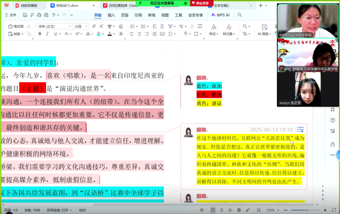 “未来演说家”系列活动由中华儿童文化艺术促进会青少年艺术教育专业委员会指导,中国传媒大学课题组提供学术支持,是面向全球4-18岁青少年的重要中文演说平台,覆盖全球十余万青少年。活动秉持“让孩子说自己的话”的理念,以“演说沟通世界”为宗旨,为海外青少年搭建展示中文能力、促进文化交流的高规格舞台。本届比赛通知发布后,我院青鸢国际中文教育团队受海外实践教育基地——印尼中华乐趣学苑主席林明珠的委托,组建了李梦洋、李佳雨、许梦瑶三人辅导小组,根据印尼参赛选手的个人特点,采用了“一对一精准辅导”教学模式。在6月13日至17日的集训期间,小组实施“一人一策”的个性化指导方案,从演讲稿的深度打磨、中文发音的精准校正,到演讲手势的精巧设计、服装搭配的专业建议,每个环节均进行了精细化指导。这种以学生为中心的教学模式,有效激发了每位选手的潜能,显著提升了他们的综合表现力。