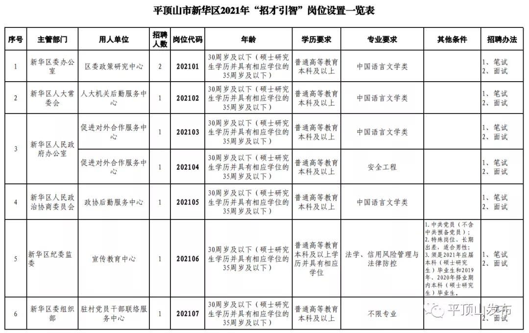 为深入贯彻党的十九大精神,全面落实中央和省委、市委关于深化人才发展体制机制改革的政策精神,加强新华区人才队伍建设,根据中共河南省委办公厅、河南省人民政府办公厅《关于印发<中国·河南招才引智创新发展大会“2021招才引智专项行动”总体方案>的通知》(豫办发电〔2021〕19号)、《中共平顶山市委平顶山市人民政府关于全面推进“鹰城英才计划”加快创新驱动发展的实施意见》(平发〔2018〕12号)等文件精神,结合我区经济社会发展需要,经研究决定,拟通过招才引智创新发展大会公开引进高层次人才29名。