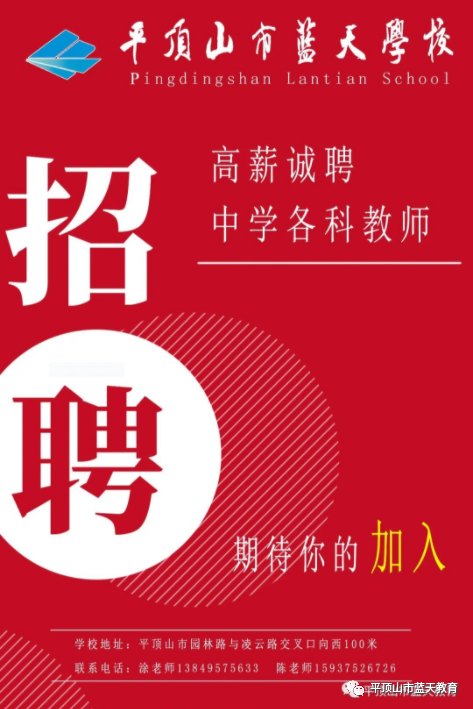 平顶山市蓝天学校是省级优秀民办学校,省、市级教育教学质量先进单位,现已发展成特色明显、名师荟萃,生源充足的寄宿制品牌学校,现有在校生3600多人,教职工340多人。中招及全市统考成绩连续多年名列市区前茅。先后被评为“平顶山市教育教学质量先进学校”“河南省民办教育教学先进学校”“河南省优秀民办学校”“省级卫生先进单位”“2019、2020市长基础教育教学质量管理奖”等荣誉称号。根据发展需要,现高薪诚聘初中各科优秀教师。